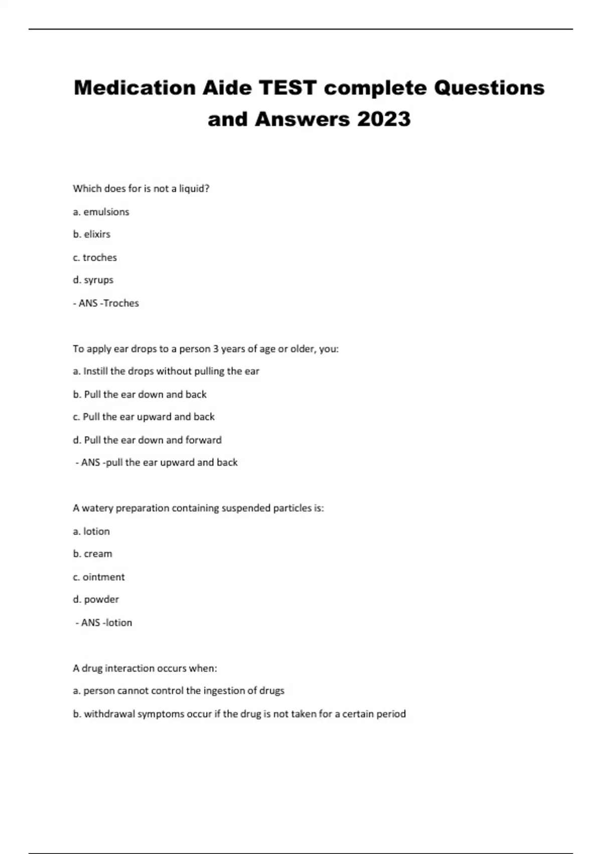 Medication Aide TEST complete Questions and Answers 2023 Which does for is not a liquid? a. emulsions b. elixirs c. troches d. syrups - ANS -Troches To apply ear drops to a person 3 years of age or older, you: a. Instill the drops without pulling the ear b. Pull the ear down and back c. Pull the ear upward and back d. Pull the ear down and forward - ANS -pull the ear upward and back A watery preparation containing suspended particles is: a. lotion b. cream c. ointment d. powder - ANS -lotion A drug interaction occurs when: a. person cannot control the ingestion of drugs b. withdrawal symptoms occur if the drug is not taken for a certain period