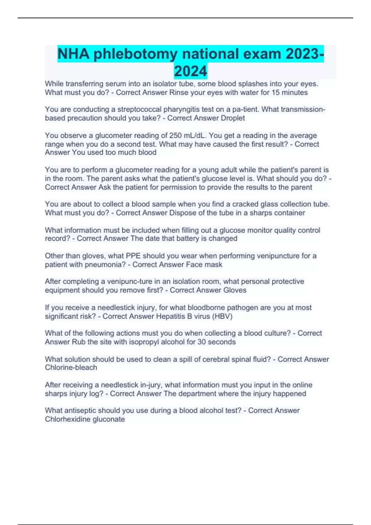 While transferring serum into an isolator tube, some blood splashes into your eyes. What must you do? - Correct Answer Rinse your eyes with water for 15 minutes You are conducting a streptococcal pharyngitis test on a pa-tient. What transmission-based precaution should you take? - Correct Answer Droplet You observe a glucometer reading of 250 mL/dL. You get a reading in the average range when you do a second test. What may have caused the first result? - Correct Answer You used too much blood You are to perform a glucometer reading for a young adult while the patient's parent is in the room. The parent asks what the patient's glucose level is. What should you do? - Correct Answer Ask the patient for permission to provide the results to the parent You are about to collect a blood sample when you find a cracked glass collection tube. What must you do? - Correct Answer Dispose of the tube in a sharps container What information must be included when filling out a glucose monitor quality control record? - Correct Answer The date that battery is changed Other than gloves, what PPE should you wear when performing venipuncture for a patient with pneumonia? - Correct Answer Face mask After completing a venipunc-ture in an isolation room, what personal protective equipment should you remove first? - Correct Answer Gloves If you receive a needlestick injury, for what bloodborne pathogen are you at most significant risk? - Correct Answer Hepatitis B virus (HBV) What of the following actions must you do when collecting a blood culture? - Correct Answer Rub the site with isopropyl alcohol for 30 seconds What solution should be used to clean a spill of cerebral spinal fluid? - Correct Answer Chlorine-bleach After receiving a needlestick in-jury, what information must you input in the online sharps injury log? - Correct Answer The department where the injury happened What antiseptic should you use during a blood alcohol test? - Correct Answer Chlorhexidine gluconate