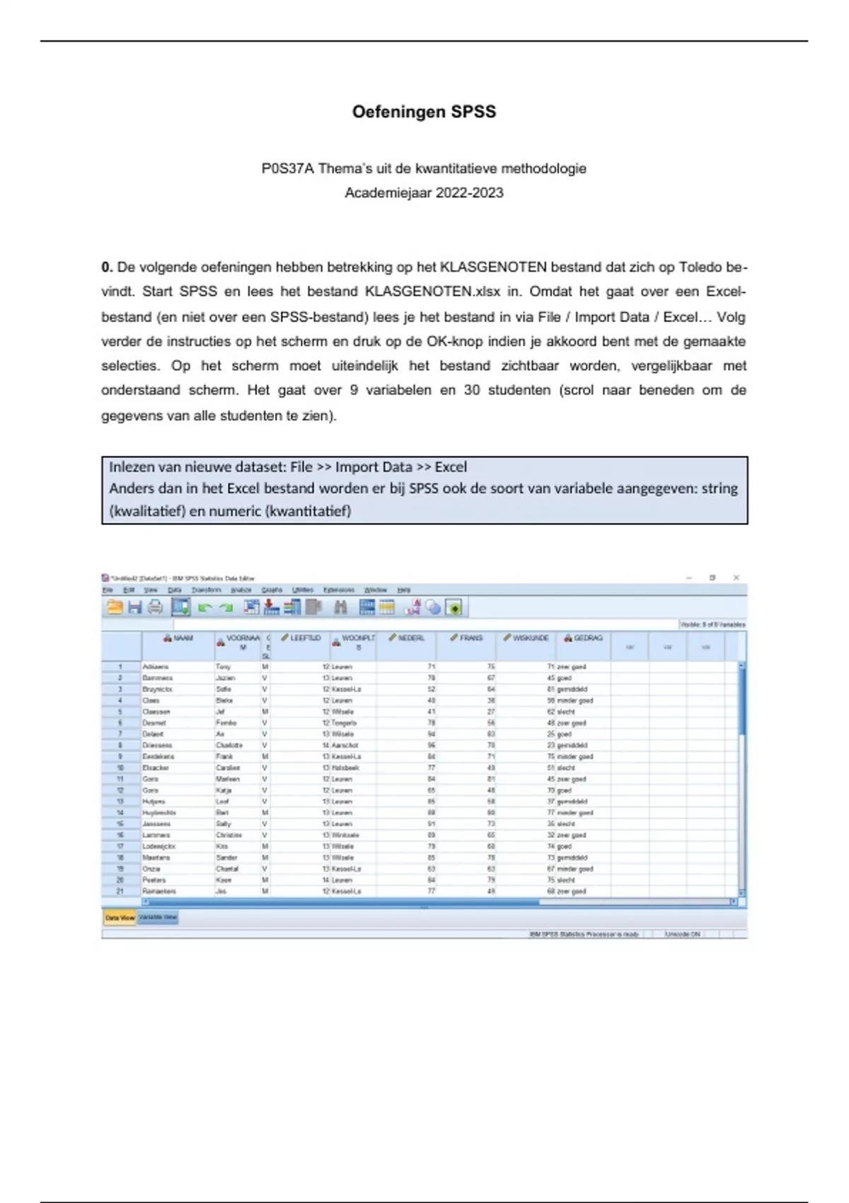 onderstaand scherm. Het gaat over 9 variabelen en 30 studenten (scrol naar beneden om de