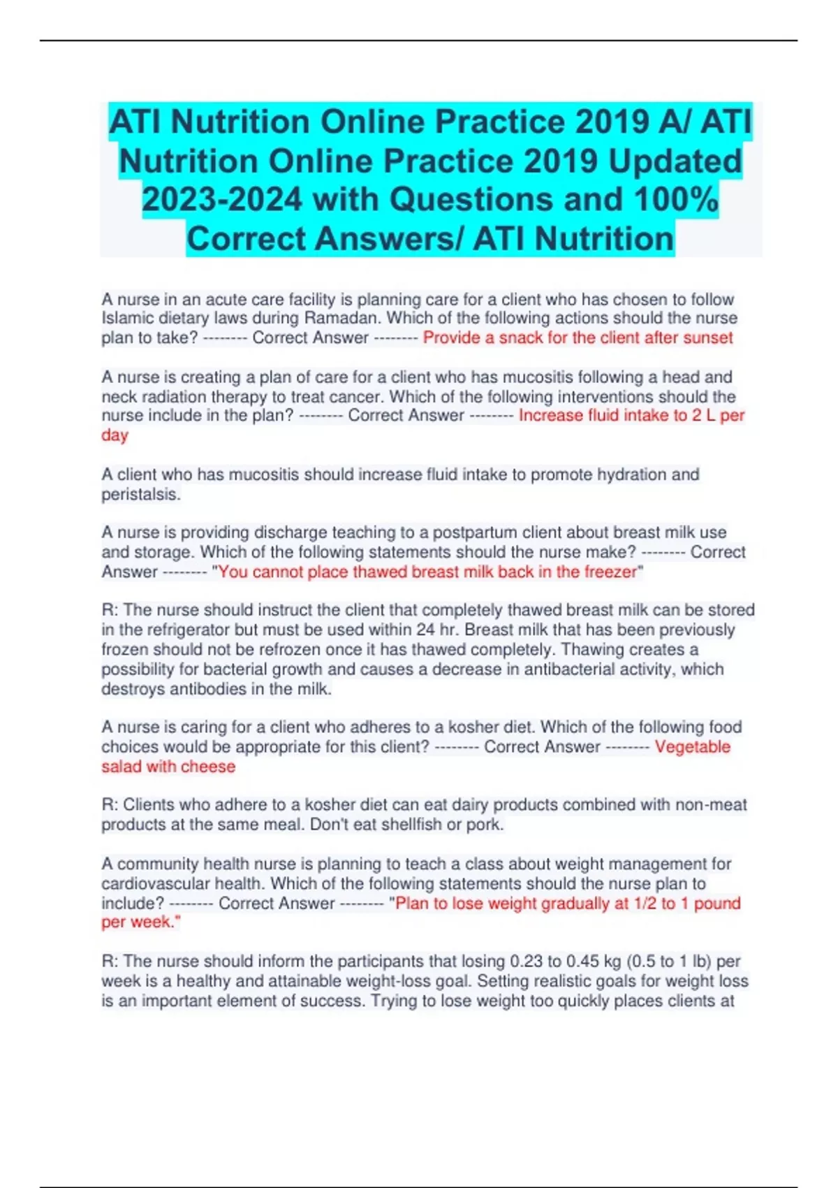ATI Nutrition Online Practice 2019 A/ ATI Nutrition Online Practice 2019 Updated with Questions and 100% Correct Answers/ ATI Nutrition