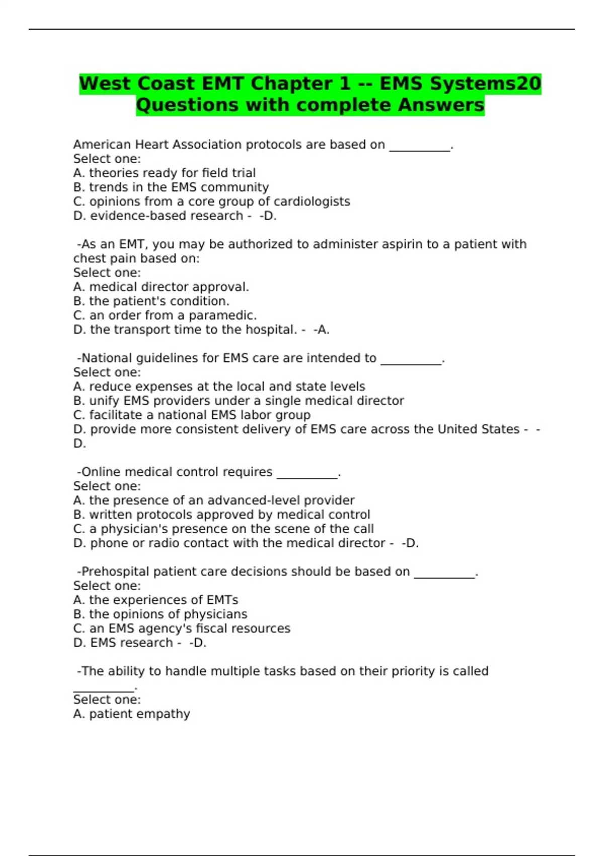 West Coast EMT Chapter 1 -- EMS Systems20 Questions with complete Answers