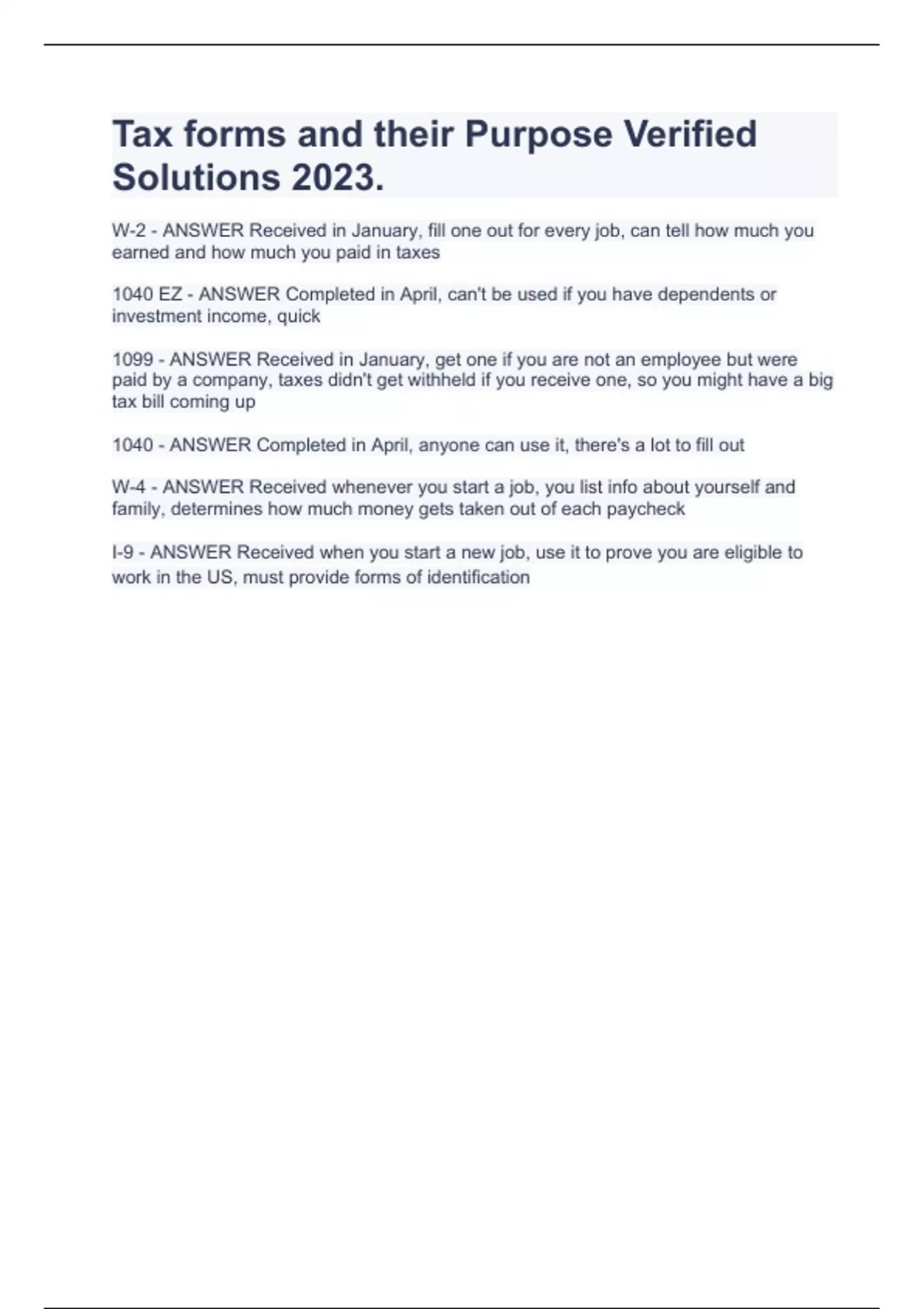 Tax forms and their Purpose Verified Solutions 2023.W-2 - ANSWER Received in January, fill one out for every job, can tell how much you earned and how much you paid in taxes 1040 EZ - ANSWER Completed in April, can't be used if you have dependents or investment income, quick 1099 - ANSWER Received in January, get one if you are not an employee but were paid by a company, taxes didn't get withheld if you receive one, so you might have a big tax bill coming up