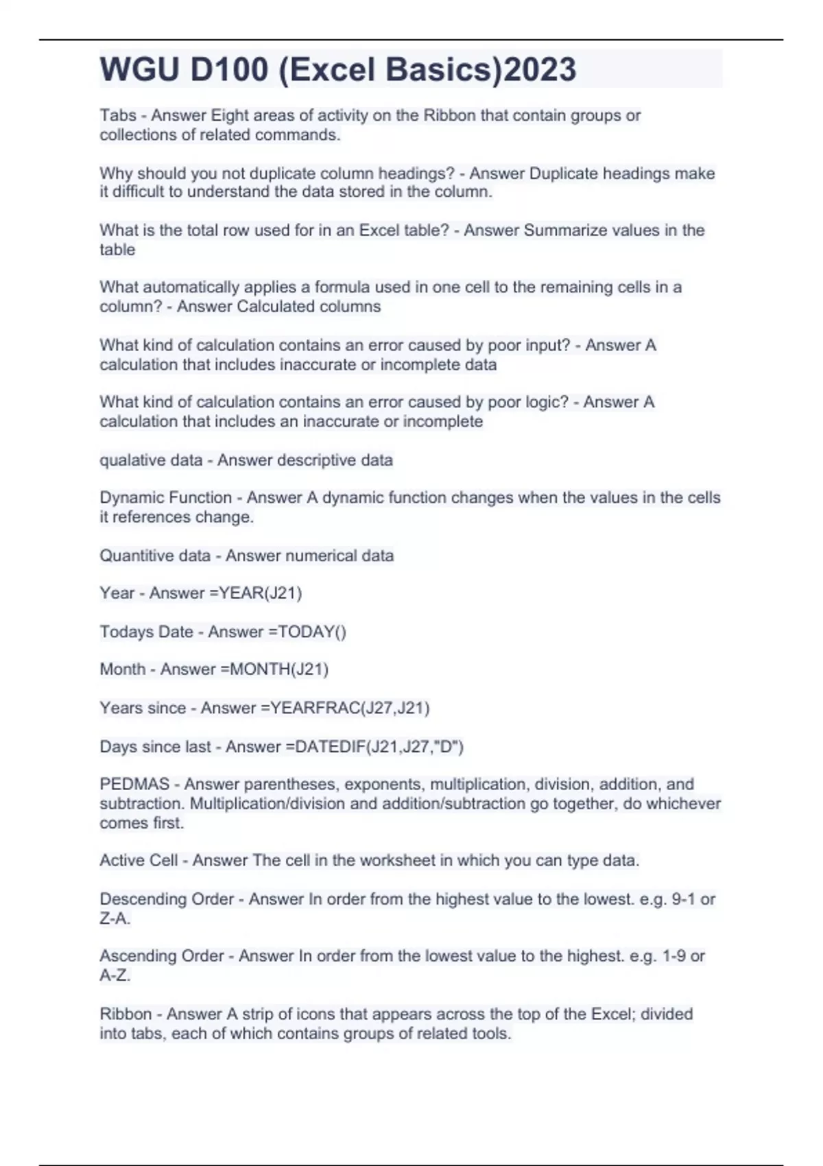 WGU D100 (Excel Basics)2023