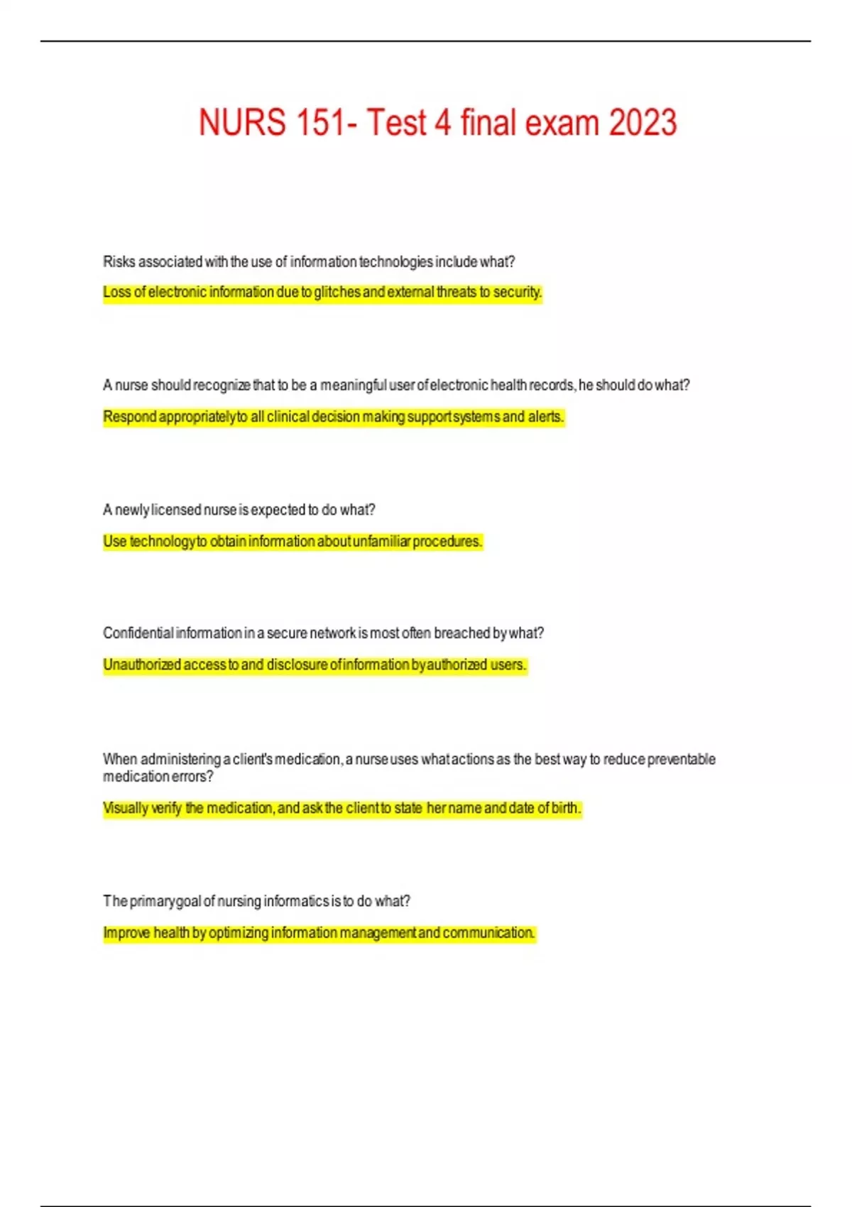 NNURS 151- Test 4 final exam 2023 Risks associated with the use of information technologies include what? Loss of electronic information due to glitches and external threats to security. A nurse should recognize that to be a meaningful user of electronic health records, he should do what? Respond appropriately to all clinical decision making support systems and alerts. A newly licensed nurse is expected to do what? Use technology to obtain information about unfamiliar procedures. Confidential information in a secure network is most often breached by what? Unauthorized access to and disclosure of information by authorized users. Confidential information in a secure network is most often breached by what? Visually verify the medication, and ask the client to state her name and date of birth. The primary goal of nursing informatics is to do what? Improve health by optimizing information management and communication. What is a standardized tool used to outline daily nursing care to clients who have common needs or medical conditions? Critical pathway A critical pathway defines the sequence of care that must be given on each day during the projected length of stay for the specific what? Specific type of condition. An informatics nurse specialist may engage in numerous roles. What is specific to her qualifications? Liaison between health care professionals, information technology department and administration. A new staff member asks a nurse what the abbreviation CDSS means. The correct response is what? Clinical decision support system. Clinical decision support system use evidence based practice and clinical guidelines to assist who? physicians, nurses, and others to make the best practice decisions based on client data. The purpose of using critical pathways to help manage the care of clients who have specific clinical problems is to what? Improve client outcomes by providing timely interventions. Use of information management systems include what? • Software, hardware, networks • Connecting networks • Electronic health records • Data stored and retrieved instantly Electronic Health Record (EHR) does what? • Stores all information about clients • Interdisciplinary team enters and access data • Database of similar clients to measure, improve care quality • Makes decisions • Communicates between team members Electronic Health Record can be used where? • Replaces paper chart • Can be shared with different part of medical system. • Hospital • MD office • Pharmacy