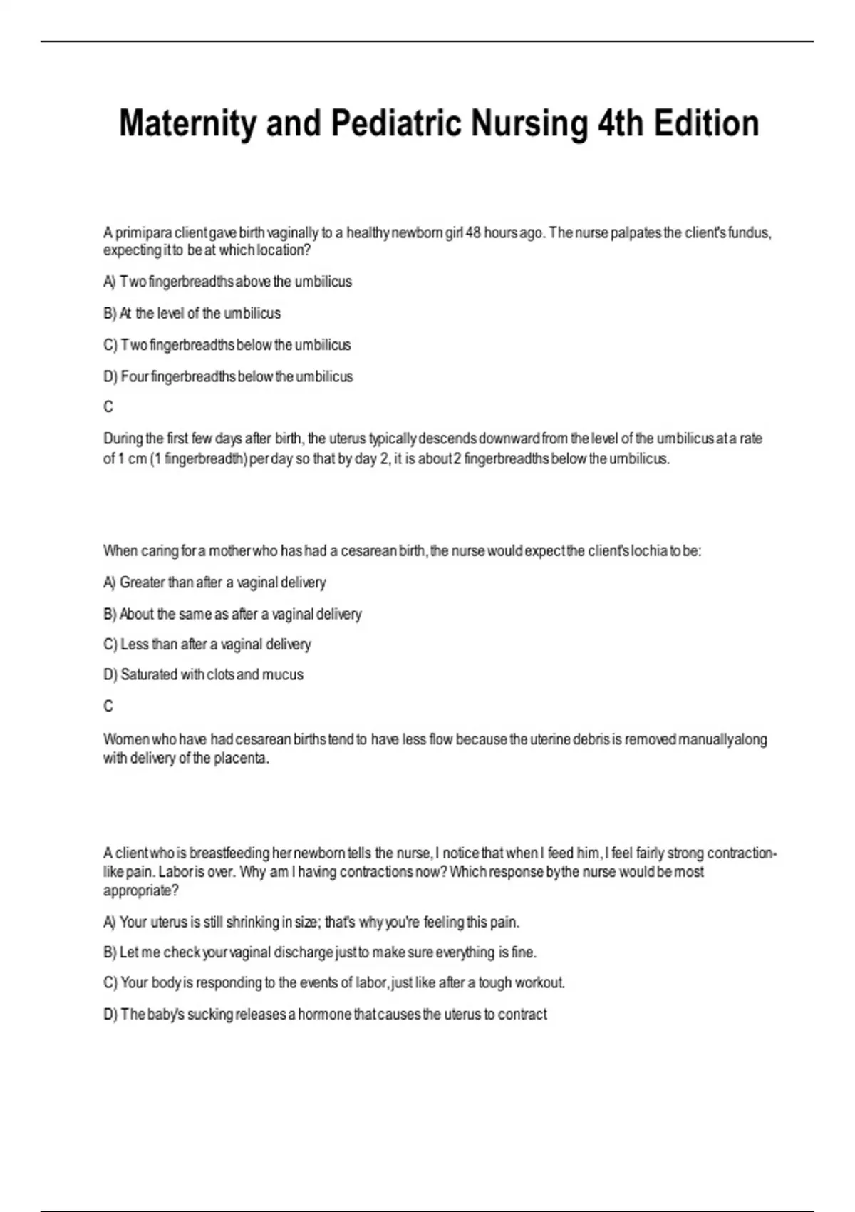 Maternity and Pediatric Nursing 4th Edition A primipara client gave birth vaginally to a healthy newborn girl 48 hours ago. The nurse palpates the client's fundus, expecting it to be at which location? A) Two fingerbreadths above the umbilicus B) At the level of the umbilicus C) Two fingerbreadths below the umbilicus D) Four fingerbreadths below the umbilicus C During the first few days after birth, the uterus typically descends downward from the level of the umbilicus at a rate of 1 cm (1 fingerbreadth) per day so that by day 2, it is about 2 fingerbreadths below the umbilicus. When caring for a mother who has had a cesarean birth, the nurse would expect the client's lochia to be: A) Greater than after a vaginal delivery B) About the same as after a vaginal delivery C) Less than after a vaginal delivery D) Saturated with clots and mucus C Women who have had cesarean births tend to have less flow because the uterine debris is removed manually along with delivery of the placenta. A client who is breastfeeding her newborn tells the nurse, I notice that when I feed him, I feel fairly strong contraction-like pain. Labor is over. Why am I having contractions now? Which response by the nurse would be most appropriate? A) Your uterus is still shrinking in size; that's why you're feeling this pain. B) Let me check your vaginal discharge just to make sure everything is fine. C) Your body is responding to the events of labor, just like after a tough workout. D) The baby's sucking releases a hormone that causes the uterus to contract D The woman is describing afterpains, which are usually stronger during breast-feeding because oxytocin released by the sucking reflex strengthens uterine contractions. Afterpains are associated with uterine involution, but the woman's description strongly correlates with the hormonal events of breast-feeding. All women experience afterpains, but they are more acute in multiparous women secondary to repeated stretching of the uterine muscles. The nurse interprets which of the following as evidence that a client is in the taking-in phase? A) Client states, He has my eyes and nose. B) Client shows interest in caring for the newborn. C) Client performs self-care independently. D) Client confidently cares for the newborn A During the taking-in phase, new mothers when interacting with their newborns spend time claiming the newborn and touching him or her, commonly identifying specific features in the newborn such as "he has my nose" or "his fingers are long like his father's." Independence in self-care and interest in caring for the newborn are typical of the taking-hold phase. Confidence in caring for the newborn is demonstrated during the letting-go phase. A postpartum client is experiencing subinvolution. When reviewing the woman's labor and birth history, which of the following would the nurse identify as being least significant to this condition? A) Early ambulation B) Prolonged labor C) Large fetus D) Pulse rate of 60 beats/minute A Factors that inhibit involution include prolonged labor and difficult birth, incomplete expulsion of amniotic membranes and placenta, uterine infection, overdistention of uterine muscles (such as by multiple gestation, hydramnios, or large singleton fetus), full bladder (which displaces the uterus and interferes with contractions), anesthesia(which relaxes uterine muscles), and close childbirth spacing. Factors that facilitate uterine involution include complete expulsion of amniotic membranes and placenta at birth, complication-free labor and birth process, breast-feeding, and early ambulation. A woman who gave birth 24 hours ago tells the nurse, I've been urinating so much over the past several hours. Which response by the nurse would be most appropriate? A) You must have an infection, so let me get a urine specimen. B) Your body is undergoing many changes that cause your bladder to fill quickly. C) Your uterus is not contracting as quickly as it should. D) The anesthesia that you received is wearing off and your bladder is working again. B Postpartum diuresis occurs as a result of several mechanisms: the large amounts of IV fluids given during labor, a decreasing antidiuretic effect of oxytocin as its level declines, the buildup and retention of extra fluids during pregnancy, and a decreasing production of aldosterone—the hormone that decreases sodium retention and increases urine production. All these factors contribute to rapid filling of the bladder within 12 hours of birth. Diuresis begins within 12 hours after childbirth and continues throughout the first week postpartum. Rapid bladder filling, possible infection, or effects of anesthesia are not involved. A group of students are reviewing the process of breast milk production. The students demonstrate understanding when they identify which hormone as responsible for milk let-down? A) Prolactin B) Estrogen C) Progesterone D) Oxytocin D Don't let this confuse you! Milk let-down/stimulation vs milk production (prolactin) Oxytocin is released from the posterior pituitary to promote milk let-down. Prolactin levels increase at term with a decrease in estrogen and progesterone; estrogen and progesterone levels decrease after the placenta is delivered. Prolactin is released from the anterior pituitary gland and initiates milk production. A nursing student is preparing a class presentation about changes in the various body systems during the postpartum period and their effects. Which of the following would the student include as influencing a postpartum woman's ability to void? (Select all that apply.) A) Use of an opioid anesthetic during labor B) Generalized swelling of the perineum C) Decreased bladder tone from regional anesthesia D) Use of oxytocin to augment labor E) Need for an episiotomy B, C, D