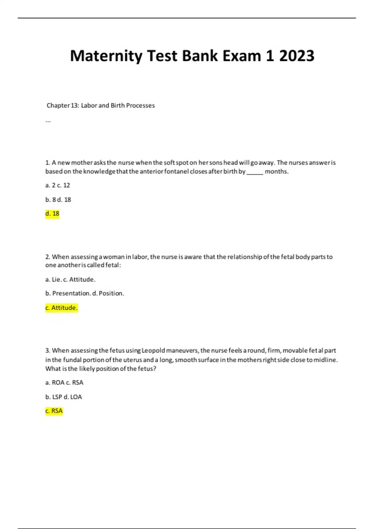 Maternity Test Bank Exam 1 2023 Chapter 13: Labor and Birth Processes ... 1. A new mother asks the nurse when the soft spot on her sons head will go away. The nurses answer is based on the knowledge that the anterior fontanel closes after birth by _____ months. a. 2 c. 12 b. 8 d. 18 d. 18 2. When assessing a woman in labor, the nurse is aware that the relationship of the fetal body parts to one another is called fetal: a. Lie. c. Attitude. b. Presentation. d. Position. c. Attitude. 3. When assessing the fetus using Leopold maneuvers, the nurse feels a round, firm, movable fetal part in the fundal portion of the uterus and a long, smooth surface in the mothers right side close to midline. What is the likely position of the fetus? a. ROA c. RSA b. LSP d. LOA c. RSA 4. The nurse has received report regarding her patient in labor. The womans last vaginal examination was recorded as 3 cm, 30%, and ?2-2. The nurses interpretation of this assessment is that: a. The cervix is effaced 3 cm, it is dilated 30%, and the presenting part is 2 cm above the ischial spines. b. The cervix is 3 cm dilated, it is effaced 30%, and the presenting part is 2 cm above the ischial spines. c. The cervix is effaced 3 cm, it is dilated 30%, and the presenting part is 2 cm below the ischial spines. d. The cervix is dilated 3 cm, it is effaced 30%, and the presenting part is 2 cm below the ischial spines. b. The cervix is 3 cm dilated, it is effaced 30%, and the presenting part is 2 cm above the ischial spines. 5. To care for a laboring woman adequately, the nurse understands that the __________ stage of labor varies the most in length? a. First c. Third b. Second d. Fourth a. First 6. The nurse would expect which maternal cardiovascular finding during labor? a. Increased cardiac output b. Decreased pulse rate c. Decreased white blood cell (WBC) count d. Decreased blood pressure a. Increased cardiac output 7. The factors that affect the process of labor and birth, known commonly as the five Ps, include all except: a. Passenger. c. Powers. b. Passageway. d. Pressure. d. Pressure. 8. The slight overlapping of cranial bones or shaping of the fetal head during labor is called: a. Lightening. c. Ferguson reflex. b. Molding. d. Valsalva maneuver. b. Molding. 9. Which presentation is described accurately in terms of both presenting part and frequency of occurrence? a. Cephalic: occiput; at least 95% c. Shoulder: scapula; 10% to 15% b. Breech: sacrum; 10% to 15% d. Cephalic: cranial; 80% to 85% a. Cephalic: occiput; at least 95% 10. With regard to factors that affect how the fetus moves through the birth canal, nurses should be aware that: a. The fetal attitude describes the angle at which the fetus exits the uterus. b. Of the two primary fetal lies, the horizontal lie is that in which the long axis of the fetus is parallel to the long axis of the mother. c. The normal attitude of the fetus is called general flexion. d. The transverse lie is preferred for vaginal birth. c. The normal attitude of the fetus is called general flexion. 11. As relates to fetal positioning during labor, nurses should be aware that: a. Position is a measure of the degree of descent of the presenting part of the fetus through the birth canal. b. Birth is imminent when the presenting part is at +4 to +5 cm below the spine. c. The largest transverse diameter of the presenting part is the suboccipitobregmatic diameter. d. Engagement is the term used to describe the beginning of labor. b. Birth is imminent when the presenting part is at +4 to +5 cm below the spine. 12. Which basic type of pelvis includes the correct description and percentage of occurrence in women? a. Gynecoid: classic female; heart shaped; 75% b. Android: resembling the male; wider oval; 15% c. Anthropoid: resembling the ape; narrower; 10% d. Platypelloid: flattened, wide, shallow; 3% d. Platypelloid: flattened, wide, shallow; 3% 13. In relation to primary and secondary powers, the maternity nurse comprehends that: a. Primary powers are responsible for effacement and dilation of the cervix. b. Effacement generally is well ahead of dilation in women giving birth for the first time; they are closer together in subsequent pregnancies. c. Scarring of the cervix caused by a previous infection or surgery may make the delivery a bit more painful, but it should not slow or inhibit dilation. d. Pushing in the second stage of labor is more effective if the woman can breathe deeply and control some of her involuntary needs to push, as the nurse directs. a. Primary powers are responsible for effacement and dilation of the cervix