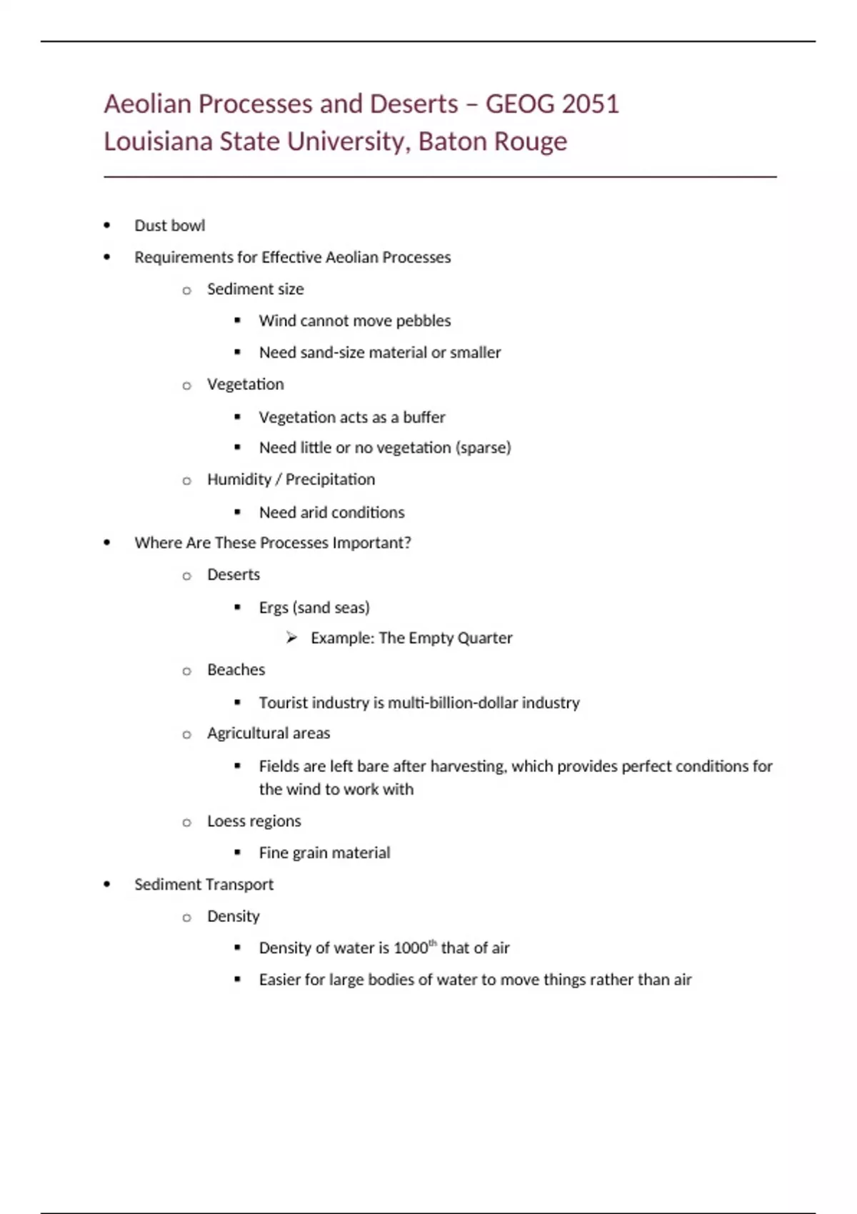 Course: GEOG 2051 Location: Louisiana State University, Baton Rouge Instructor: Namikas What's Included: In-depth class notes on Aeolian processes and deserts