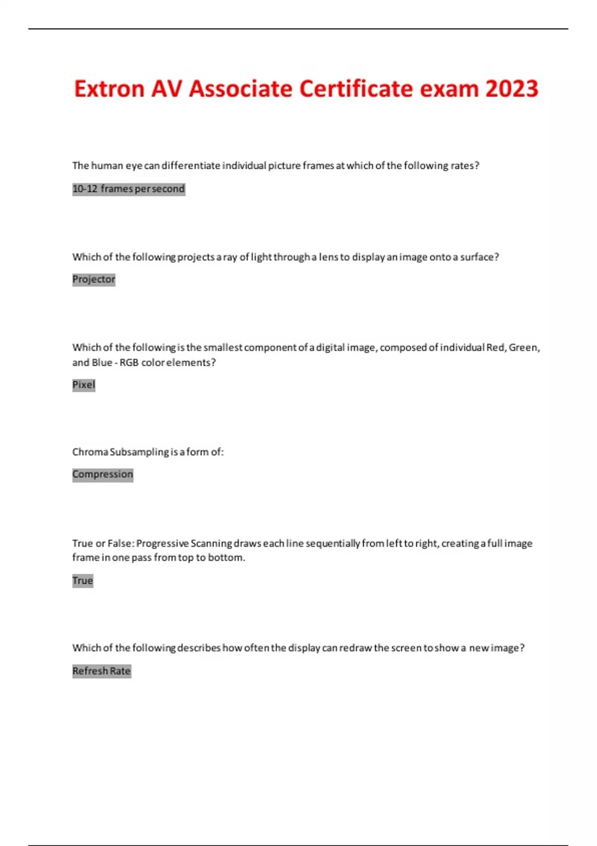 Extron AV Associate Certificate exam 2023 The human eye can differentiate individual picture frames at which of the following rates? 10-12 frames per second Which of the following projects a ray of light through a lens to display an image onto a surface? Projector Which of the following is the smallest component of a digital image, composed of individual Red, Green, and Blue - RGB color elements? Pixel Chroma Subsampling is a form of: Compression True or False: Progressive Scanning draws each line sequentially from left to right, creating a full image frame in one pass from top to bottom. True Which of the following describes how often the display can redraw the screen to show a new image? Refresh Rate Which of the following interfaces renders images as micro packets similar to network data? DisplayPort Which of the following is used for connecting peripheral devices (keyboard, mouse) to computers, as well as for power to charge portable devices? USB Which one of the following describes the relationship of width and height of an image? Aspect Ratio Which one of the following measures an image's width and height using pixels? Resolution Which one of the following consists of thin organic layers between two conductors (transparent anode and metallic cathode) that convert electric current into light? OLED Which one of the following is a reflective surface made up of thousands of tiny mirrors, each representing a single pixel? DLP Which one of the following is the smallest component of a screen image, composed of individual Red, Green, and Blue - RGB primary colors? Pixels Interlaced scanning may be described as: Images drawn in two alternate fields as odd & even numbered lines Which one of the following indicates the amount of data used per pixel to present color information? Color Bit Depth Which one of the following is a digital transmission interface for uncompressed video, multi-channel audio, and control data that also supports High-bandwidth Digital Content Protection - HDCP? HDMI (High Definition Multimedia Interface) Which one of the following digital broadcast standards is adopted in Europe, Asia, and Africa? DVB (Digital Video Broadcasting) DVI and HDMI both use a signaling method known as: TMDS (Transmission-Minimized Differential Signaling) Which of the following defines the science or study of sound, how it's created, its ability to travel within a space, and the way it's managed? Acoustics Which of the following represents a logarithmic ratio to measure the change in sound intensity or electric signals? Decibel (dB) Which of the following has a ground wire, and carries analog signals as one hot wire and one cold wire in reverse polarity to cancel noise and interference? Balanced cables Which of the following connector is commonly used for twisted pair cabling that carries digital audio over the network? RJ-45