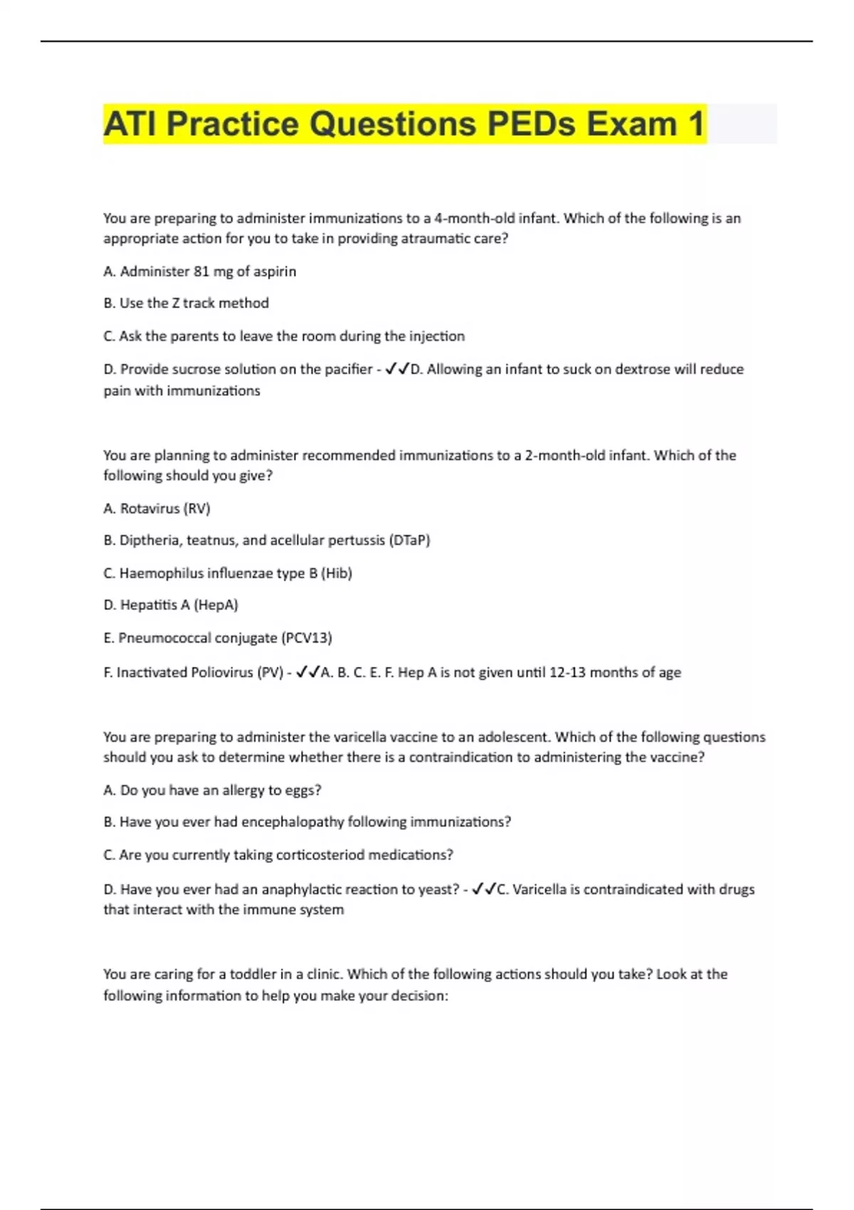 You are preparing to administer immunizations to a 4-month-old infant. Which of the following is an appropriate action for you to take in providing atraumatic care? A. Administer 81 mg of aspirin B. Use the Z track method C. Ask the parents to leave the room during the injection D. Provide sucrose solution on the pacifier - D. Allowing an infant to suck on dextrose will reduce pain with immunizations You are planning to administer recommended immunizations to a 2-month-old infant. Which of the following should you give? A. Rotavirus (RV) B. Diptheria, teatnus, and acellular pertussis (DTaP) C. Haemophilus influenzae type B (Hib) D. Hepatitis A (HepA) E. Pneumococcal conjugate (PCV13) F. Inactivated Poliovirus (PV) - A. B. C. E. F. Hep A is not given until 12-13 months of age You are preparing to administer the varicella vaccine to an adolescent. Which of the following questions should you ask to determine whether there is a contraindication to administering the vaccine? A. Do you have an allergy to eggs? B. Have you ever had encephalopathy following immunizations? C. Are you currently taking corticosteriod medications? D. Have you ever had an anaphylactic reaction to yeast? - C. Varicella is contraindicated with drugs that interact with the immune system You are caring for a toddler in a clinic. Which of the following actions should you take? Look at the following information to help you make your decision: