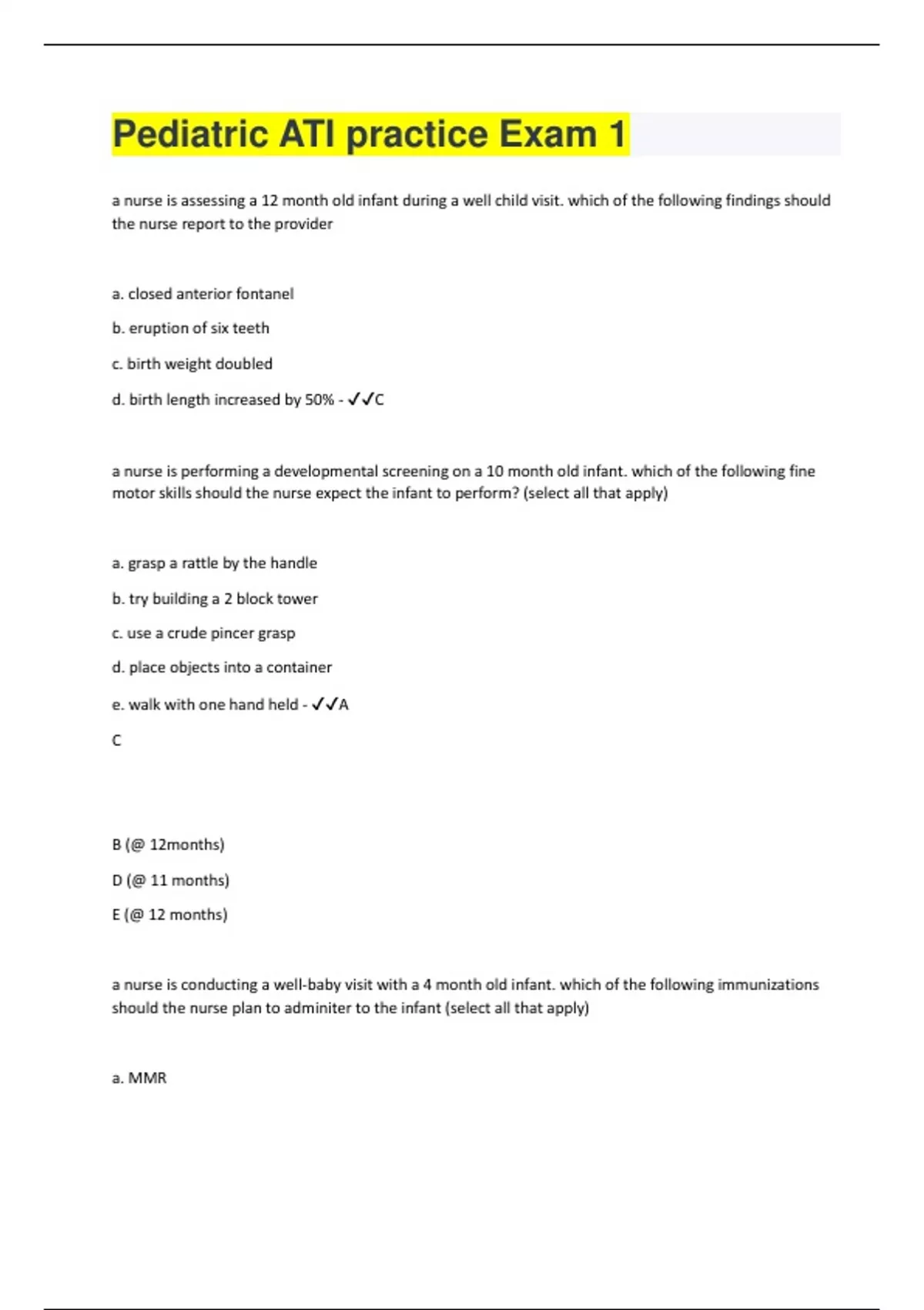 a nurse is assessing a 12 month old infant during a well child visit. which of the following findings should the nurse report to the provider a. closed anterior fontanel b. eruption of six teeth c. birth weight doubled d. birth length increased by 50% - C a nurse is performing a developmental screening on a 10 month old infant. which of the following fine motor skills should the nurse expect the infant to perform? (select all that apply) a. grasp a rattle by the handle b. try building a 2 block tower c. use a crude pincer grasp d. place objects into a container e. walk with one hand held - A C B (@ 12months) D (@ 11 months) E (@ 12 months) a nurse is conducting a well-baby visit with a 4 month old infant. which of the following immunizations should the nurse plan to adminiter to the infant (select all that apply) a. MMR