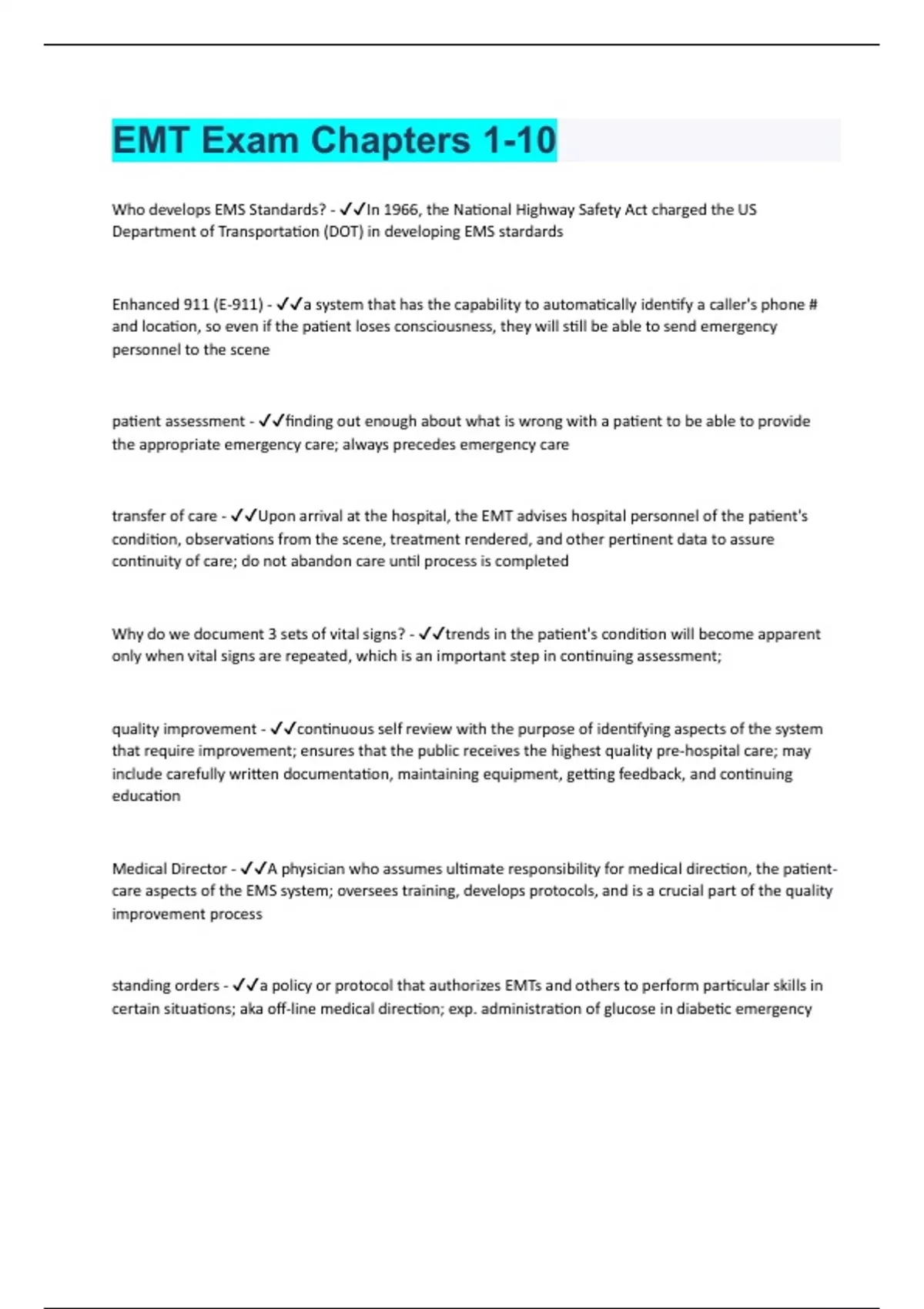 Who develops EMS Standards? - In 1966, the National Highway Safety Act charged the US Department of Transportation (DOT) in developing EMS stardards Enhanced 911 (E-911) - a system that has the capability to automatically identify a caller's phone # and location, so even if the patient loses consciousness, they will still be able to send emergency personnel to the scene patient assessment - finding out enough about what is wrong with a patient to be able to provide the appropriate emergency care; always precedes emergency care transfer of care - Upon arrival at the hospital, the EMT advises hospital personnel of the patient's condition, observations from the scene, treatment rendered, and other pertinent data to assure continuity of care; do not abandon care until process is completed Why do we document 3 sets of vital signs? - trends in the patient's condition will become apparent only when vital signs are repeated, which is an important step in continuing assessment; quality improvement - continuous self review with the purpose of identifying aspects of the system that require improvement; ensures that the public receives the highest quality pre-hospital care; may include carefully written documentation, maintaining equipment, getting feedback, and continuing education Medical Director - A physician who assumes ultimate responsibility for medical direction, the patientcare aspects of the EMS system; oversees training, develops protocols, and is a crucial part of the quality improvement process standing orders - a policy or protocol that authorizes EMTs and others to perform particular skills in certain situations; aka off-line medical direction; exp. administration of glucose in diabetic emergency