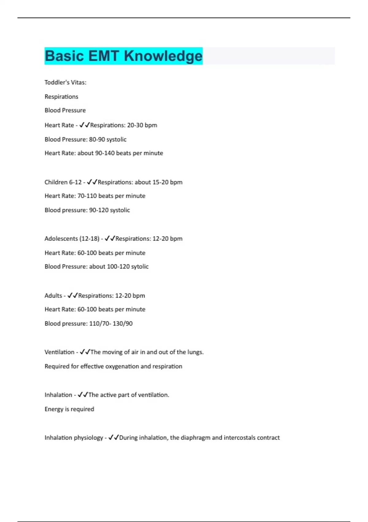 Toddler's Vitas: Respirations Blood Pressure Heart Rate - Respirations: 20-30 bpm Blood Pressure: 80-90 systolic Heart Rate: about 90-140 beats per minute Children 6-12 - Respirations: about 15-20 bpm Heart Rate: 70-110 beats per minute Blood pressure: 90-120 systolic Adolescents (12-18) - Respirations: 12-20 bpm Heart Rate: 60-100 beats per minute Blood Pressure: about 100-120 sytolic Adults - Respirations: 12-20 bpm Heart Rate: 60-100 beats per minute Blood pressure: 110/70- 130/90 Ventilation - The moving of air in and out of the lungs. Required for effective oxygenation and respiration Inhalation - The active part of ventilation. Energy is required Inhalation physiology - During inhalation, the diaphragm and intercostals contract