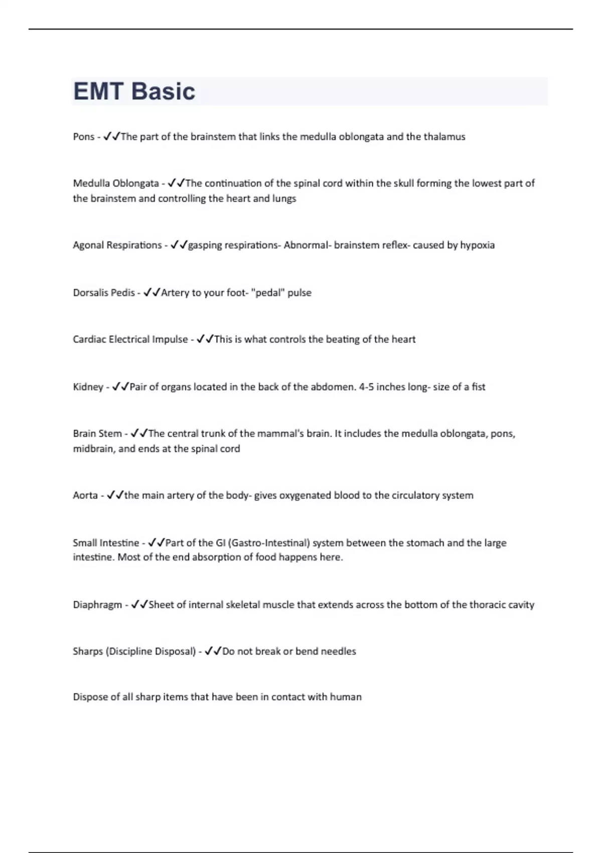 Pons - The part of the brainstem that links the medulla oblongata and the thalamus Medulla Oblongata - The continuation of the spinal cord within the skull forming the lowest part of the brainstem and controlling the heart and lungs Agonal Respirations - gasping respirations- Abnormal- brainstem reflex- caused by hypoxia Dorsalis Pedis - Artery to your foot- "pedal" pulse Cardiac Electrical Impulse - This is what controls the beating of the heart Kidney - Pair of organs located in the back of the abdomen. 4-5 inches long- size of a fist Brain Stem - The central trunk of the mammal's brain. It includes the medulla oblongata, pons, midbrain, and ends at the spinal cord Aorta - the main artery of the body- gives oxygenated blood to the circulatory system Small Intestine - Part of the GI (Gastro-Intestinal) system between the stomach and the large intestine. Most of the end absorption of food happens here. Diaphragm - Sheet of internal skeletal muscle that extends across the bottom of the thoracic cavity Sharps (Discipline Disposal) - Do not break or bend needles Dispose of all sharp items that have been in contact with human