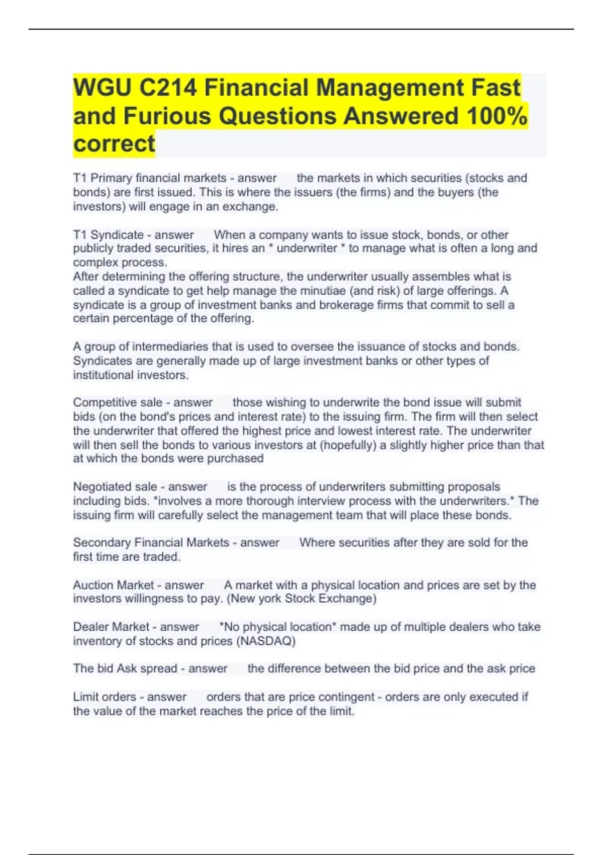 WGU C214 Financial Management Fast and Furious Questions Answered 100% correct T1 Primary financial markets the markets in which securities (stocks and bonds) are first issued. This is where the issuers (the firms) and the buyers (the investors) will engage in an exchange. T1 Syndicate When a company wants to issue stock, bonds, or other publicly traded securities, it hires an underwriter to manage what is often a long and complex process. After determining the offering structure, the underwriter usually assembles what is called a syndicate to get help manage the minutiae (and risk) of large offerings. A syndicate is a group of investment banks and brokerage firms that commit to sell a certain percentage of the offering. A group of intermediaries that is used to oversee the issuance of stocks and bonds. Syndicates are generally made up of large investment banks or other types of institutional investors. Competitive sale those wishing to underwrite the bond issue will submit bids (on the bond's prices and interest rate) to the issuing firm. The firm will then select the underwriter that offered the highest price and lowest interest rate. The underwriter will then sell the bonds to various investors at (hopefully) a slightly higher price than that at which the bonds were purchased Negotiated sale is the process of underwriters submitting proposals including bids. involves a more thorough interview process with the underwriters. The issuing firm will carefully select the management team that will place these bonds. Secondary Financial Markets Where securities after they are sold for the first time are traded. Auction Market A market with a physical location and prices are set by the investors willingness to pay. (New york Stock Exchange) Dealer Market No physical location made up of multiple dealers who take inventory of stocks and prices (NASDAQ) The bid Ask spread the difference between the bid price and the ask price Limit orders orders that are price contingent - orders are only executed if the value of the market reaches the price of the limit. Market Orders Orders that are time contingent - First come first serve Friedmans three roles of prices. 1. Prices convey information to consumers. 2. prices affect incentives 3. prices affect the distribution of income Price Efficiency whether prices fully reflect all of the available information about a particular security Dollar Returns calculated by taking the difference between the price of the security during the previous time period and the price of the security at the current time period, plus any additional cash flow that came from the security Percentage Returns Percentage returns are calculated by simply dividing the dollar returns by the price of the security at time t-1, or the previous time period. Agency Cost costs that are incurred when management does not act in the best interests of shareholders 2 issues that effect profit maximization 1. Agency Costs 2. Potential effect of focusing solely on profits (Ethics) Cash Flow Statement Cash flows from operations, investing and financing activities Cash accounting counts cash out as expense and cash in as revenue Accrual accounting Revenue is recognized when the earnings process is complete. Revenue Recognition Timing of recognition of sales or income based on certain rules. Gross Profit Revenue - Cost of goods sold (COGS) EBIT Earnings before Interest and Taxes (AKA Operating Income) COGS Cost of goods sold = direct labor and materials. Gross Fixed Assets the original cost of the firm's fixed assets before accumulated depreciation Net PP&E original purchase price (historical cost) minus accumulated depreciation Historical Cost What the asset was originally purchased for not the current value. Used in accrual accounting. (most assets are stated at the original cost less depreciation) Retained Earnings money put back into the company from prior net income. Net Income = Dividends + Change in retained Earnings there are only two things a company can do with net income 1) pay it out as dividends to shareholders, or 2) retain it within the firm. New Retained Earnings = Old Retained Earnings + Net Income - Dividends Free cash flow (FCF) the cash that can be distributed after funding required reinvestment in PP&E as well as increased working capital. Gross Cash Flows the sum of CFO, CFI, and CFF Things that cause managers to move cash from one category to another Core activities Cash flow management Market pressure Difference between CFO and Net income ... indirect method start with net income and adjust for differences between net income and CFO. CFO= Net Income + depreciation expenses + Change in Operating accounts CFI = Changes in PPE End Gross PPE - Begining Gross PPE Net PPE Gross PPE- Accumulated Depreciation. Gross PPE Net PPE+ Accumulated Depreciation FCFF the cash distributable to all the providers of capital (i.e., to both debt and equity holders) and is most commonly used in financial analysis FCFE the cash distributable to the equity holders after satisfying all obligations to debt holders Dividends the cash actually distributed to stockholders; CAPEX Capital Expenditures How much the firm spends on fixed assets. Ratio one number from a financial statement and divide it by another so that you can analyze the health of a firm or compare two firms. 4 categories of ratios liquidity asset use efficiency financing profitability Benefits of Ratios Standardization flexibility focus Current Ratio A liquidity tool Current assets/ current liabilities Higher number is better number of assets the firm has for every liability Current liability Debt requiring payment within the next 12 months Current assets Assets that will earn revenue within the next year. Quick Ratio A liquidity tool (Current assets - inventory)/current liabilities High number is better number of assets the firm has minus the inventory for every liability. Inventory is the least liquid of assets. Accounts receivable turnover 