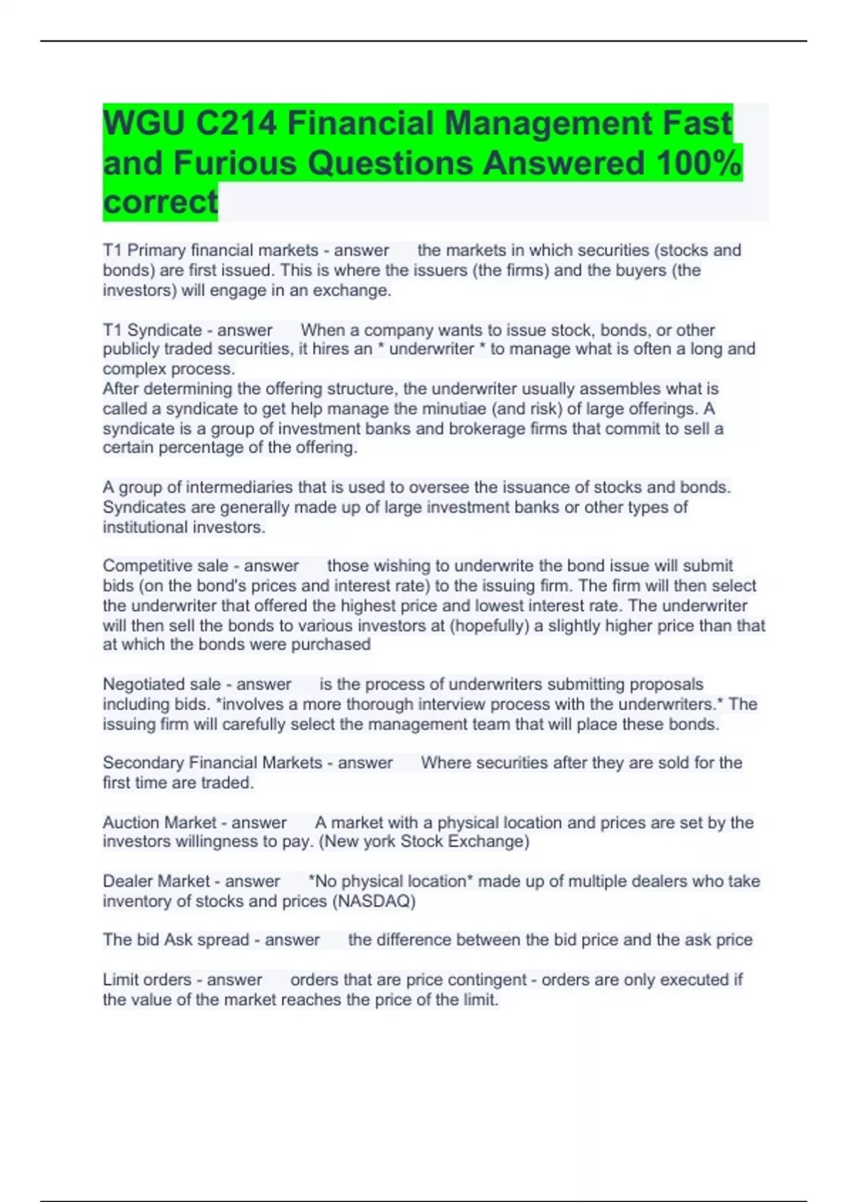 WGU C214 Financial Management Fast and Furious Questions Answered 100% correct T1 Primary financial markets the markets in which securities (stocks and bonds) are first issued. This is where the issuers (the firms) and the buyers (the investors) will engage in an exchange. T1 Syndicate When a company wants to issue stock, bonds, or other publicly traded securities, it hires an underwriter to manage what is often a long and complex process. After determining the offering structure, the underwriter usually assembles what is called a syndicate to get help manage the minutiae (and risk) of large offerings. A syndicate is a group of investment banks and brokerage firms that commit to sell a certain percentage of the offering. A group of intermediaries that is used to oversee the issuance of stocks and bonds. Syndicates are generally made up of large investment banks or other types of institutional investors. Competitive sale those wishing to underwrite the bond issue will submit bids (on the bond's prices and interest rate) to the issuing firm. The firm will then select the underwriter that offered the highest price and lowest interest rate. The underwriter will then sell the bonds to various investors at (hopefully) a slightly higher price than that at which the bonds were purchased Negotiated sale is the process of underwriters submitting proposals including bids. involves a more thorough interview process with the underwriters. The issuing firm will carefully select the management team that will place these bonds. Secondary Financial Markets Where securities after they are sold for the first time are traded. Auction Market A market with a physical location and prices are set by the investors willingness to pay. (New york Stock Exchange) Dealer Market No physical location made up of multiple dealers who take inventory of stocks and prices (NASDAQ) The bid Ask spread the difference between the bid price and the ask price Limit orders orders that are price contingent - orders are only executed if the value of the market reaches the price of the limit. Market Orders Orders that are time contingent - First come first serve Friedmans three roles of prices. 1. Prices convey information to consumers. 2. prices affect incentives 3. prices affect the distribution of income Price Efficiency whether prices fully reflect all of the available information about a particular security Dollar Returns calculated by taking the difference between the price of the security during the previous time period and the price of the security at the current time period, plus any additional cash flow that came from the security Percentage Returns Percentage returns are calculated by simply dividing the dollar returns by the price of the security at time t-1, or the previous time period. Agency Cost costs that are incurred when management does not act in the best interests of shareholders 2 issues that effect profit maximization 1. Agency Costs 2. Potential effect of focusing solely on profits (Ethics) Cash Flow Statement Cash flows from operations, investing and financing activities Cash accounting counts cash out as expense and cash in as revenue Accrual accounting Revenue is recognized when the earnings process is complete. Revenue Recognition Timing of recognition of sales or income based on certain rules. Gross Profit Revenue - Cost of goods sold (COGS) EBIT Earnings before Interest and Taxes (AKA Operating Income) COGS Cost of goods sold = direct labor and materials. Gross Fixed Assets the original cost of the firm's fixed assets before accumulated depreciation Net PP&E original purchase price (historical cost) minus accumulated depreciation Historical Cost What the asset was originally purchased for not the current value. Used in accrual accounting. (most assets are stated at the original cost less depreciation) Retained Earnings money put back into the company from prior net income. Net Income = Dividends + Change in retained Earnings there are only two things a company can do with net income 1) pay it out as dividends to shareholders, or 2) retain it within the firm. New Retained Earnings = Old Retained Earnings + Net Income - Dividends Free cash flow (FCF) the cash that can be distributed after funding required reinvestment in PP&E as well as increased working capital. Gross Cash Flows the sum of CFO, CFI, and CFF Things that cause managers to move cash from one category to another Core activities Cash flow management Market pressure Difference between CFO and Net income ... indirect method start with net income and adjust for differences between net income and CFO. CFO= Net Income + depreciation expenses + Change in Operating accounts CFI = Changes in PPE End Gross PPE - Begining Gross PPE Net PPE Gross PPE- Accumulated Depreciation. Gross PPE Net PPE+ Accumulated Depreciation FCFF the cash distributable to all the providers of capital (i.e., to both debt and equity holders) and is most commonly used in financial analysis FCFE the cash distributable to the equity holders after satisfying all obligations to debt holders Dividends the cash actually distributed to stockholders; CAPEX Capital Expenditures How much the firm spends on fixed assets. Ratio one number from a financial statement and divide it by another so that you can analyze the health of a firm or compare two firms. 4 categories of ratios liquidity asset use efficiency financing profitability Benefits of Ratios Standardization flexibility focus Current Ratio A liquidity tool Current assets/ current liabilities Higher number is better number of assets the firm has for every liability Current liability Debt requiring payment within the next 12 months Current assets Assets that will earn revenue within the next year. Quick Ratio A liquidity tool (Current assets - inventory)/current liabilities High number is better number of assets the firm has minus the inventory for every liability. Inventory is the least liquid of assets. Accounts receivable turnover 