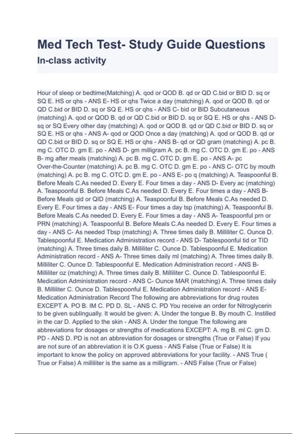 Med Tech Test- Study Guide Questions And Verified Answers A+ GRADED Hour of sleep or bedtime(Matching) A. qod or QOD B. qd or QD C.bid or BID D. sq or SQ E. HS or qhs - ANS E- HS or qhs Twice a day (matching) A. qod or QOD B. qd or QD C.bid or BID D. sq or SQ E. HS or qhs - ANS C- bid or BID Subcutaneous (matching) A. qod or QOD B. qd or QD C.bid or BID D. sq or SQ E. HS or qhs - ANS D- sq or SQ Every other day (matching) A. qod or QOD B. qd or QD C.bid or BID D. sq or SQ E. HS or qhs - ANS A- qod or QOD Once a day (matching) A. qod or QOD B. qd or QD C.bid or BID D. sq or SQ E. HS or qhs - ANS B- qd or QD gram (matching) A. pc B. mg C. OTC D. gm E. po - ANS D- gm milligram A. pc B. mg C. OTC D. gm E. po - ANS B- mg after meals (matching) A. pc B. mg C. OTC D. gm E. po - ANS A- pc Over-the-Counter (matching) A. pc B. mg C. OTC D. gm E. po - ANS C- OTC by mouth (matching) A. pc B. mg C. OTC D. gm E. po - ANS E- po q (matching) A. Teaspoonful B. Before Meals C.As needed D. Every E. Four times a day - ANS D- Every ac (matching) A. Teaspoonful B. Before Meals C.As needed D. Every E. Four times a day - ANS B- Before Meals qid or QID (matching) A. Teaspoonful B. Before Meals C.As needed D. Every E. Four times a day - ANS E- Four times a day tsp (matching) A. Teaspoonful B. Before Meals C.As needed D. Every E. Four times a day - ANS A- Teaspoonful prn or PRN (matching) A. Teaspoonful B. Before Meals C.As needed D. Every E. Four times a day - ANS C- As needed Tbsp (matching) A. Three times daily B. Milliliter C. Ounce D. Tablespoonful E. Medication Administration record - ANS D- Tablespoonful tid or TID (matching) A. Three times daily B. Milliliter C. Ounce D. Tablespoonful E. Medication Administration record - ANS A- Three times daily ml (matching) A. Three times daily B. Milliliter C. Ounce D. Tablespoonful E. Medication Administration record - ANS B- Milliliter oz (matching) A. Three times daily B. Milliliter C. Ounce D. Tablespoonful E. Medication Administration record - ANS C- Ounce MAR (matching) A. Three times daily B. Milliliter C. Ounce D. Tablespoonful E. Medication Administration record - ANS E- Medication Administration Record The following are abbreviations for drug routes EXCEPT A. PO B. IM C. PD D. SL - ANS C. PD You receive an order for Nitroglycerin to be given sublingually. It would be given: A. Under the tongue B. By mouth C. Instilled in the car D. Applied to the skin - ANS A. Under the tongue The following are abbreviations for dosages or strengths of medications EXCEPT: A. mg B. ml C. gm D. PD - ANS D. PD is not an abbreviation for dosages or strengths (True or False) If you are not sure of an abbreviation it is O.K guess - ANS False (True or False) It is important to know the policy on approved abbreviations for your facility. - ANS True ( True or False) A milliliter is the same as a milligram.