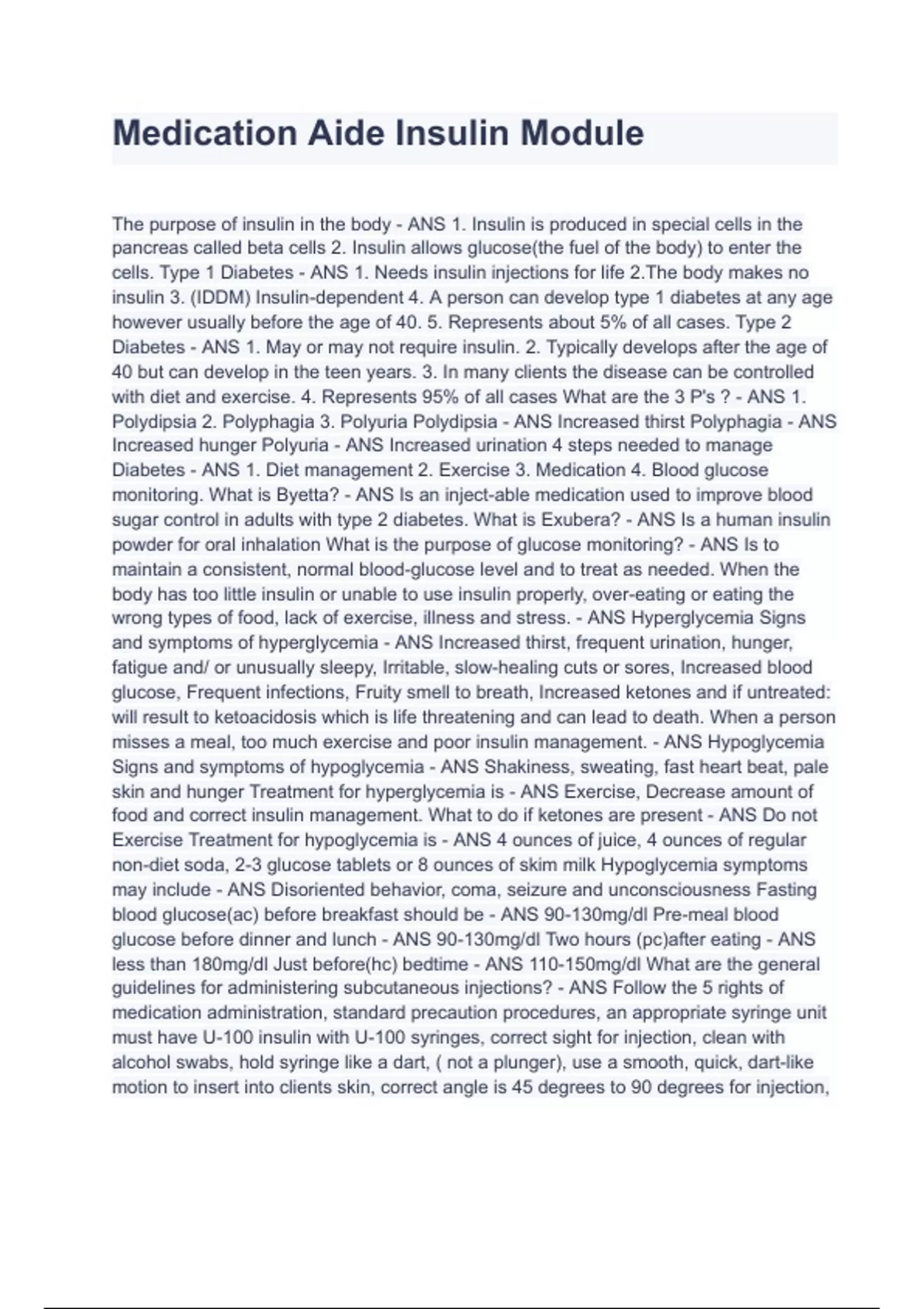 Medication Aide Insulin Module COMPLETE WITH ANSWERS. 2022/2023 (A+ GRADED)