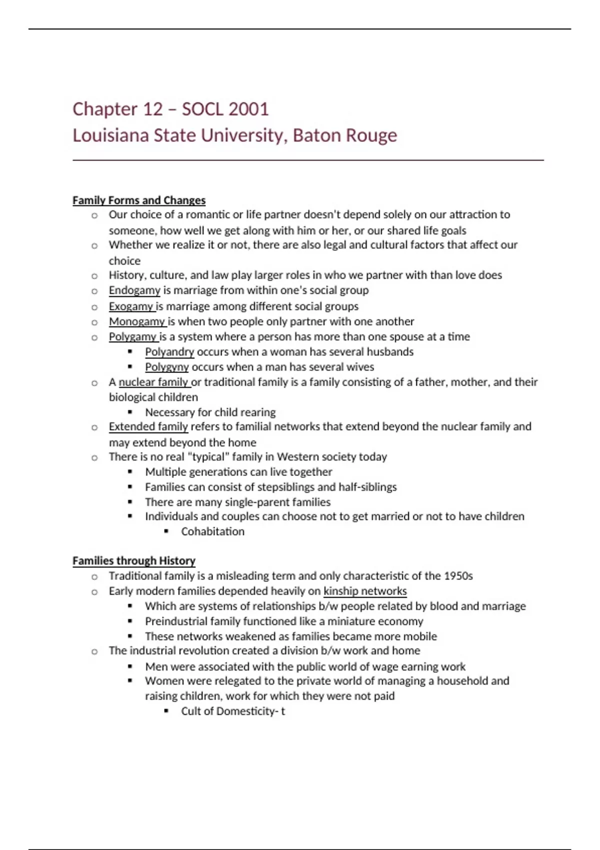Course: SOCL 2001 Location: Louisiana State University, Baton Rouge Instructor: Chauvin What's Included: In-depth class notes covering chapter 12