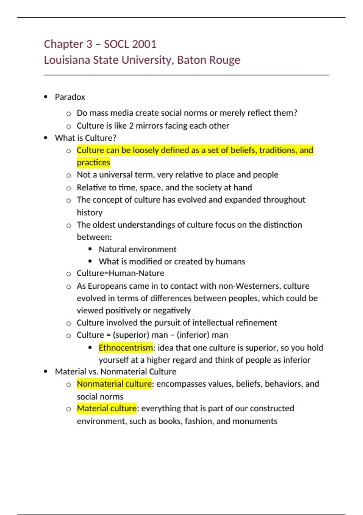 Course: SOCL 2001 Location: Louisiana State University, Baton Rouge Instructor: Chauvin What's Included: In-depth class notes covering chapter 3