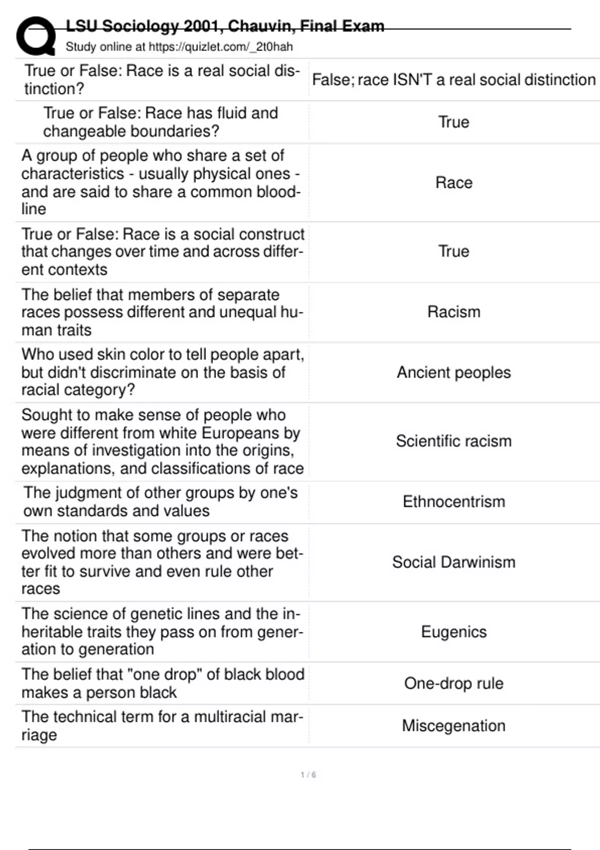 Course: SOCL 2001 Location: Louisiana State University, Baton Rouge Instructor: Chauvin What's Included: 63 flashcards to help you prepare for (and crush!) the final exam!