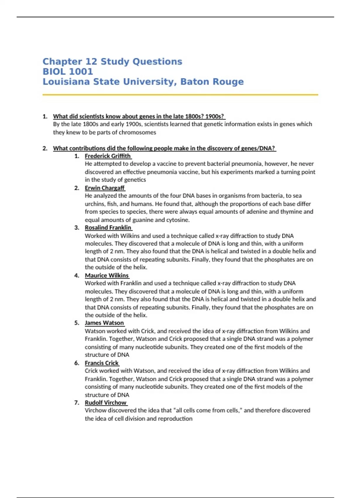 Course: BIOL 1001 Location: Louisiana State University, Baton Rouge Instructor: Paul What's Included: Study questions and exam prep materials for Chapter 12 on Exam 3!