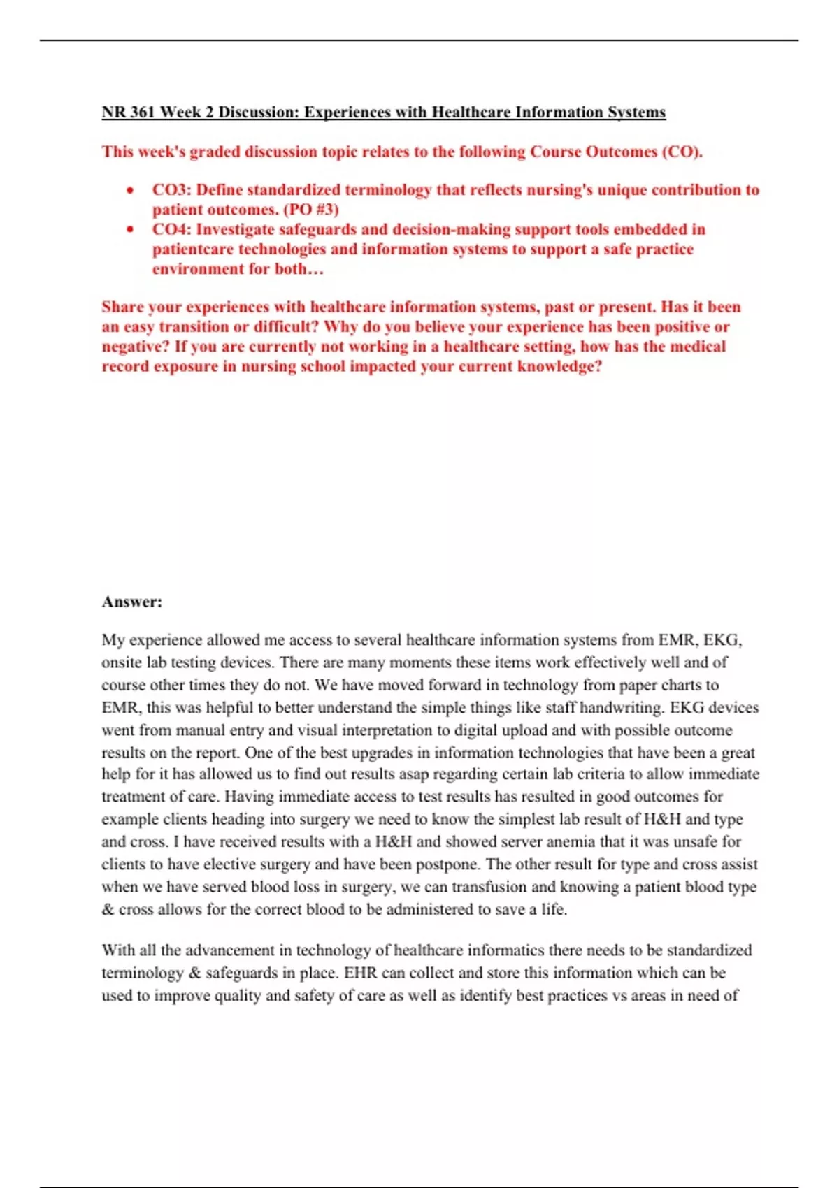 NR 361 Week 2 Discussion Experiences With Healthcare Information Systems Chamberlain