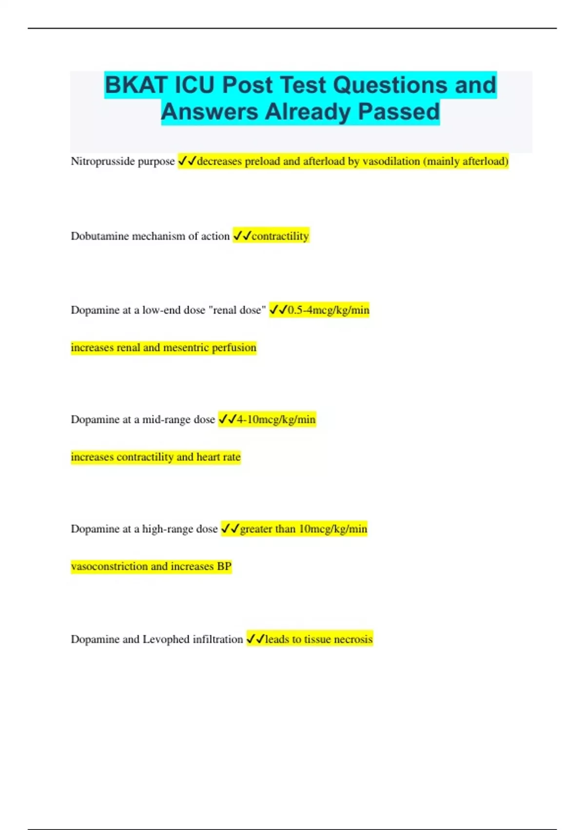 BKAT ICU Post Test Questions and Answers Already Passed Nitroprusside purpose decreases preload and afterload by vasodilation (mainly afterload) Dobutamine mechanism of action contractility Dopamine at a low-end dose "renal dose" 0.5-4mcg/kg/min increases renal and mesentric perfusion Dopamine at a mid-range dose 4-10mcg/kg/min increases contractility and heart rate Dopamine at a high-range dose greater than 10mcg/kg/min vasoconstriction and increases BP Dopamine and Levophed infiltration leads to tissue necrosis Dopamine antidote regitine (phentolamine) TpA monitor for bleeding-hemorrhagic CVA diltiazem (cardizem) works by? (calcium channel blocker) slows ventricular rate by slowing conduction through the SA and AV node Diltazem (cardizem) biggest effect on which hemodynamic hypotension diltazem is used for patients with a-fib or a-flutter amiodarone (Cordarone) is a antiarrythmic prolongs the cardiac duration You MUST use a __________ when using amiodarone infusion 0.22 micron filter Watch out for ____________ in patients on a amiodarone infusion hypotension, prolongation of QT interval and bradycardia amiodarone is used for patients with a-fib, a-flutter and VT how much amiodarone is given to a stable VT with a pulse and a unstable pulseless VT/VF? 150mg over 10min for VT with pulse 300mg push; repeat x1 at 150mg Epinephrine has what effect on the body? increases