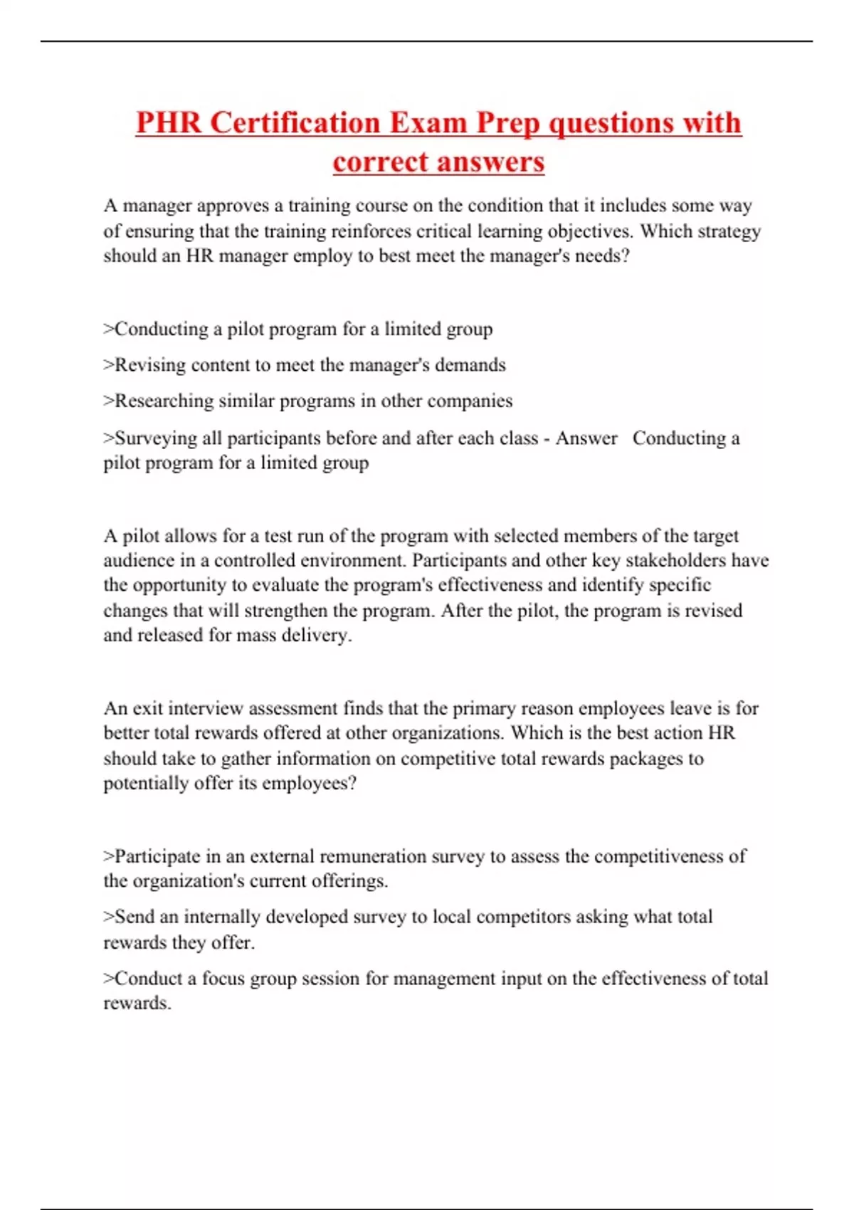 A manager approves a training course on the condition that it includes some way of ensuring that the training reinforces critical learning objectives. Which strategy should an HR manager employ to best meet the manager's needs? Conducting a pilot program for a limited group Revising content to meet the manager's demands Researching similar programs in other companies Surveying all participants before and after each class - Answer Conducting a pilot program for a limited group A pilot allows for a test run of the program with selected members of the target audience in a controlled environment. Participants and other key stakeholders have the opportunity to evaluate the program's effectiveness and identify specific changes that will strengthen the program. After the pilot, the program is revised and released for mass delivery. An exit interview assessment finds that the primary reason employees leave is for better total rewards offered at other organizations. Which is the best action HR should take to gather information on competitive total rewards packages to potentially offer its employees? Participate in an external remuneration survey to assess the competitiveness of the organization's current offerings. Send an internally developed survey to local competitors asking what total rewards they offer. Conduct a focus group session for management input on the ef