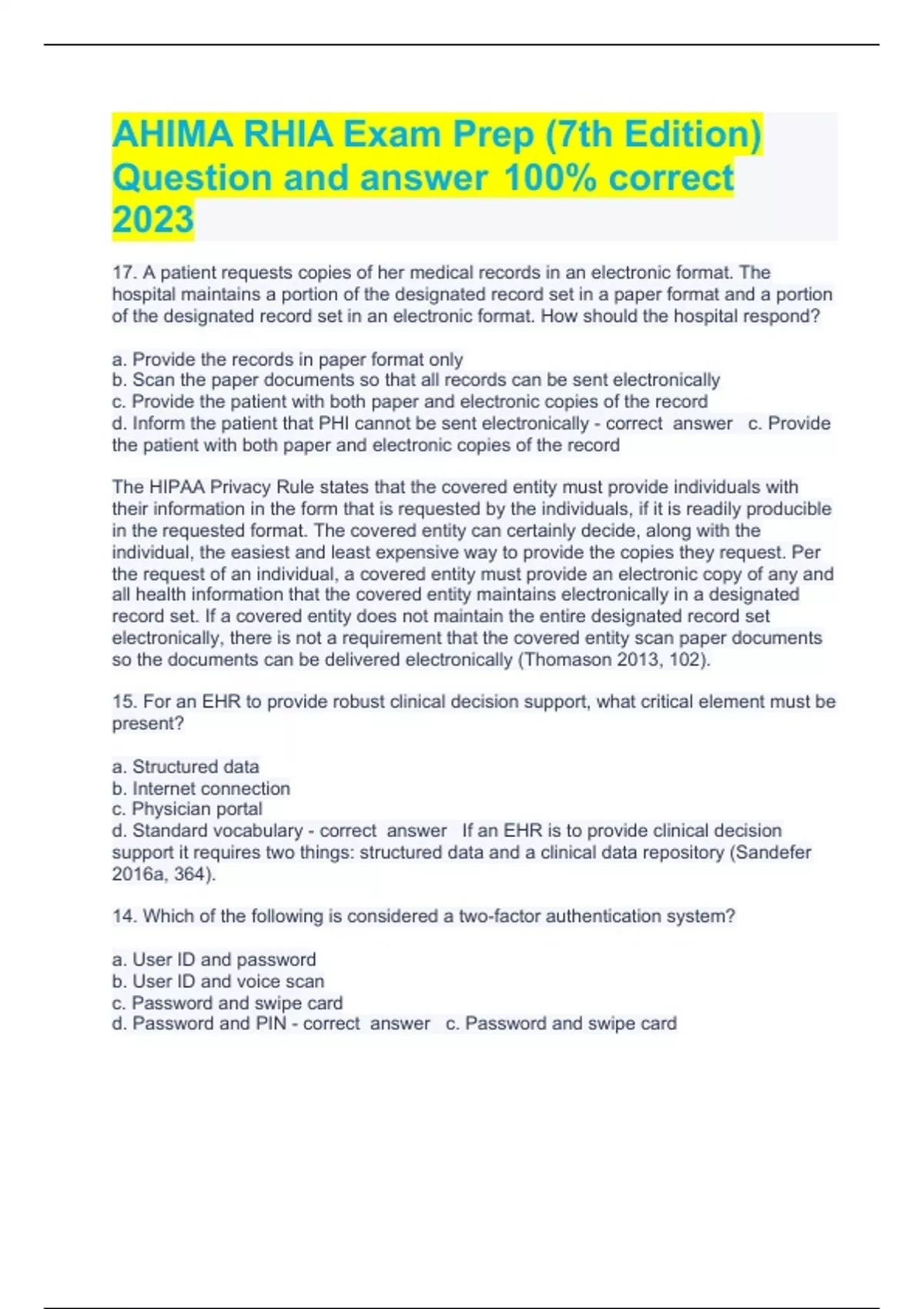 AHIMA RHIA Exam Prep (7th Edition) Question and answer 100% correct . A patient requests copies of her medical records in an electronic format. The hospital maintains a portion of the designated record set in a paper format and a portion of the designated record set in an electronic format. How should the hospital respond? a. Provide the records in paper format only b. Scan the paper documents so that all records can be sent electronically c. Provide the patient with both paper and electronic copies of the record d. Inform the patient that PHI cannot be sent electronically c. Provide the patient with both paper and electronic copies of the record The HIPAA Privacy Rule states that the covered entity must provide individuals with their information in the form that is requested by the individuals, if it is readily producible in the requested format. The covered entity can certainly decide, along with the individual, the easiest and least expensive way to provide the copies they request. Per the request of an individual, a covered entity must provide an electronic copy of any and all health information that the covered entity maintains electronically in a designated record set. If a covered entity does not maintain the entire designated record set electronically, there is not a requirement that the covered entity scan paper documents so the documents can be delivered electronically (Thomason 2013, 102). 15. For an EHR to provide robust clinical decision support, what critical element must be present? a. Structured data b. Internet connection c. Physician portal d. Standard vocabulary If an EHR is to provide clinical decision support it requires two things: structured data and a clinical data repository (Sandefer 2016a, 364). 14. Which of the following is considered a two-factor authentication system? a. User ID and password b. User ID and voice scan c. Password and swipe card d. Password and PIN c. Password and swipe card The three methods of two-factor authentication are something you know, such as a password or PIN; something you have, such as an ATM card, token, or swipe/smart card; and something you are, such as a biometric fingerprint, voice scan, iris, or retinal scan (Sayles and Trawick 2014, 219). Under RBRVS, which elements are used to calculate a Medicare payment? a. Work value and extent of the physical exam b. Malpractice expenses and detail of the patient history c. Work value and practice expenses d. Practice expenses and review of systems Each Resource-Based Relative Value Scale (RBRVS) comprises three elements: physician work, physician practice expense, and malpractice, each of which is a national average available in the Federal Register (Casto and Forrestal 2015, 150). 12. The predefined process icon is used in flowcharting to indicate: a. A process in which actions are being performed by humans b. A point in the process at which participants must evaluate the status of the process c. Formal procedures that participants are expected to carry out the same way every time d. A point in the process at which the participants must record data in paper-based or computer- based formats The rectangle with double lines on the side in a flowchart is a predefined process icon. This symbol represents the formal procedure that participants are expected to carry out the same way every time (Shaw and Carter 2015, 198).