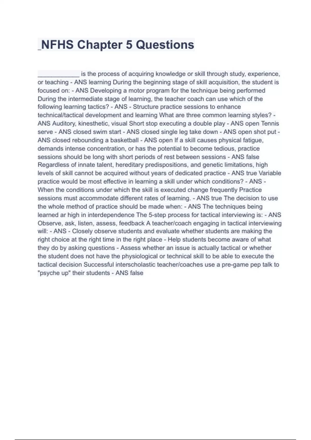 NFHS Chapter 5 Questions With Answers ____________ is the process of acquiring knowledge or skill through study, experience, or teaching - ANS learning During the beginning stage of skill acquisition, the student is focused on: - ANS Developing a motor program for the technique being performed During the intermediate stage of learning, the teacher coach can use which of the following learning tactics? - ANS - Structure practice sessions to enhance technical/tactical development and learning What are three common learning styles? - ANS Auditory, kinesthetic, visual Short stop executing a double play - ANS open Tennis serve - ANS closed swim start - ANS closed single leg take down - ANS open shot put - ANS closed rebounding a basketball - ANS open If a skill causes physical fatigue, demands intense conce