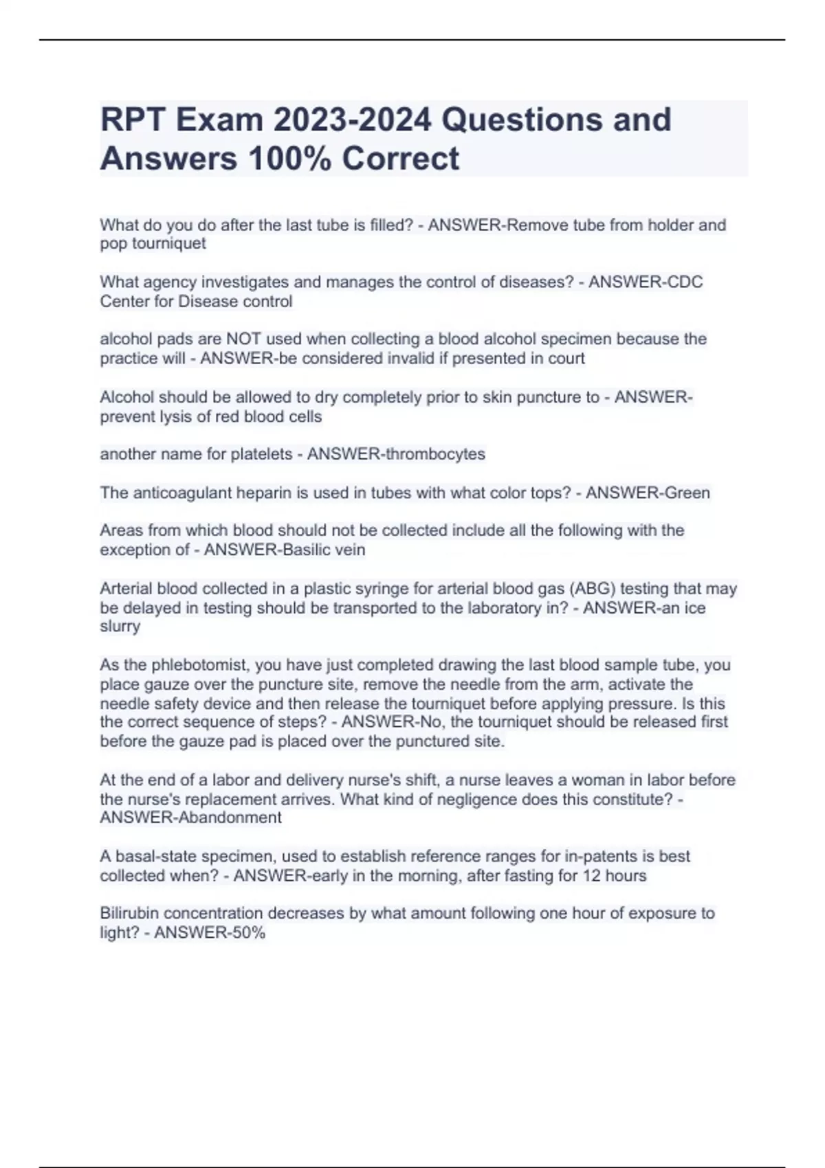 RPT Exam Questions and Answers 100% CorrectRPT Exam Questions and Answers 100% CorrectRPT Exam Questions and Answers 100% CorrectRPT Exam Questions and Answers 100% CorrectRPT Exam Questions and Answers 100% CorrectRPT Exam Questions and Answers 100% CorrectRPT Exam Questions and Answers 100% CorrectWhat do you do after the last tube is filled? - ANSWER-Remove tube from holder and pop tourniquet What agency investigates and manages the control of diseases? - ANSWER-CDC Center for Disease control alcohol pads are NOT used when collecting a blood alcohol specimen because the practice will - ANSWER-be considered invalid if presented in court Alcohol should be allowed to dry completely prior to skin puncture to - ANSWER-prevent lysis of red blood cells another name for platelets - ANSWER-thrombocytes The anticoagulant heparin is used in tubes with what color tops? - ANSWER-Green Areas from which blood should not be collected include all the following with the exception of - ANSWER-Basilic vein Arterial blood collected in a plastic syringe for arterial blood gas (ABG) testing that may be delayed in testing should be transported to the laboratory in? - ANSWER-an ice slurry As the phlebotomist, you have just completed drawing the last blood sample tube, you place gauze over the puncture site, remove the needle from the arm, activate the needle safety device and then release the tourniquet before applying pressure. Is this the correct sequence of steps? - ANSWER-No, the tourniquet should be released first before the gauze pad is placed over the punctured site.