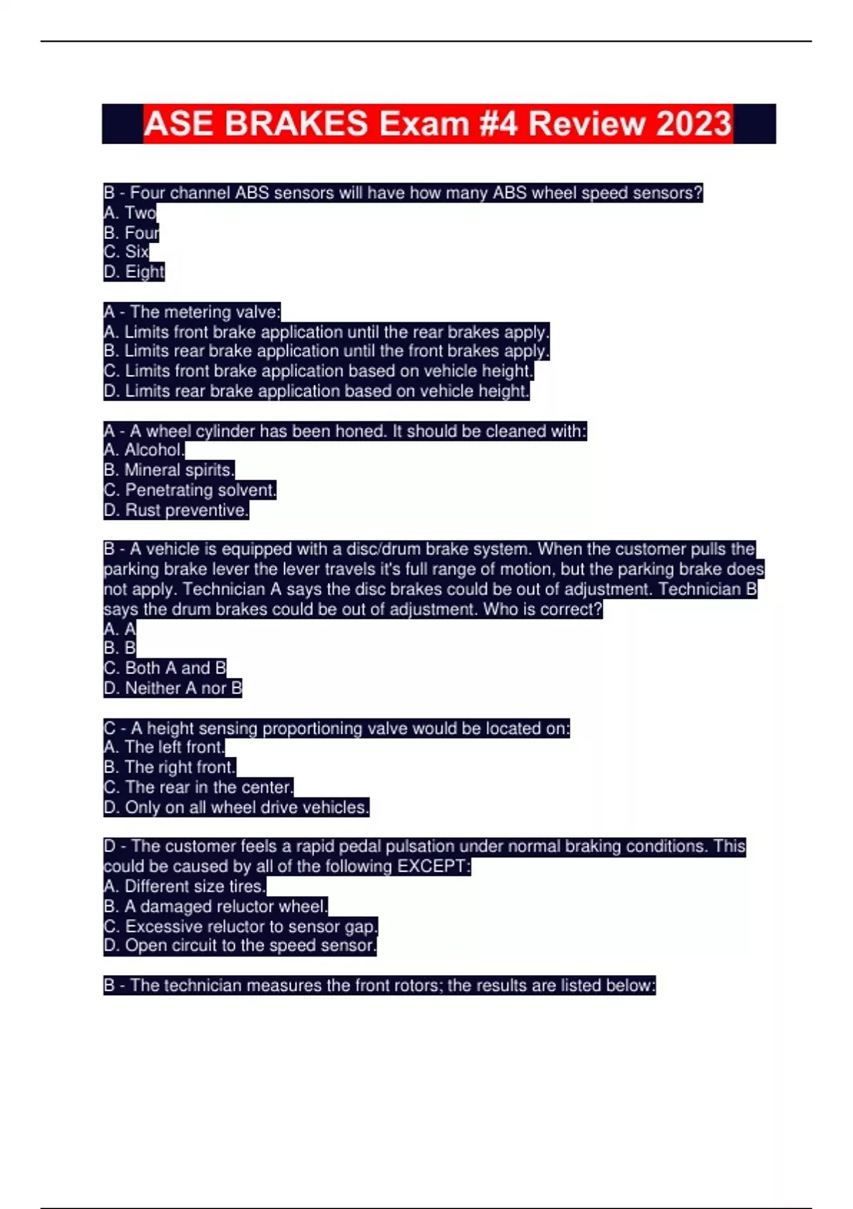 B - Four channel ABS sensors will have how many ABS wheel speed sensors? A. Two B. Four C. Six D. Eight A - The metering valve: A. Limits front brake application until the rear brakes apply. B. Limits rear brake application until the front brakes apply. C. Limits front brake application based on vehicle height. D. Limits rear brake application based on vehicle height. A - A wheel cylinder has been honed. It should be cleaned with: A. Alcohol. B. Mineral spirits. C. Penetrating solvent. D. Rust preventive. B - A vehicle is equipped with a disc/drum brake system. When the customer pulls the parking brake lever the lever travels it's full range of motion, but the parking brake does not apply. Technician A says the disc brakes could be out of adjustment. Technician B says the drum brakes could be out of adjustment. Who is correct? A. A B. B C. Both A and B D. Neither A nor B C - A height sensing proportioning valve would be located on: A. The left front. B. The right front. C. The rear in the center. D. Only on all wheel drive vehicles. D - The customer feels a rapid pedal pulsation under normal braking conditions. This could be caused by all of the following EXCEPT: A. Different size tires. B. A damaged reluctor wheel. C. Excessive reluctor to sensor gap. D. Open circuit to the speed sensor. B - The technician measures the front rotors; the results are listed below: Minimum Rotor Thickness, Specifications: .898" (22.80mm) Actual Rotor Thickness, Left: .889" (22.58mm) Actual Rotor Thickness, Right: .809" (25.12mm) Which of the following should be done? A. Replace the left rotor. B. Replace both rotors. C. Reuse both rotors. D. Replace the right rotor. C - Technician A says the primary show goes toward the front of the vehicle. Technician B says the secondary shoe goes toward the rear of the vehicle. Who is right? A. A B. B C. Both A and B D. Neither A nor B D - Which of the following would most commonly be used as the drive axle retaining nut on a front wheel drive vehicle? A. Self-locking nylon insert nut . B. Plain hex nut without a locking feature. C. Double nuts with a lock between them. D. Self-locking crimp style nut. C - The rotor thickness specification is 1.250" (31.75mm). In three places the rotor measures 1.350" (34.29mm). In a fourth place the rotor measures 1.248" (31.70mm). Which of the following is true? A. The rotor should be turned to the smallest measurement and reused. B. The rotor should be reused as is. C. The rotor should be replaced. D. The measurement was performed incorrectly. B - Technician A says the same tool is used to make a double flare or ISO flare. Technician B says the same tool is used to make a double flare and a single flare. Who is correct? A. A B. B C. Both A and B D. Neither A nor B B - Which of the following statements is true concerning the brake warning lights? A. The master cylinder can cause the amber light to illuminate. B. The master cylinder can cause the red light to illuminate. C. If the amber light is illuminated the vehicle must be pulled to the side of the road and towed.