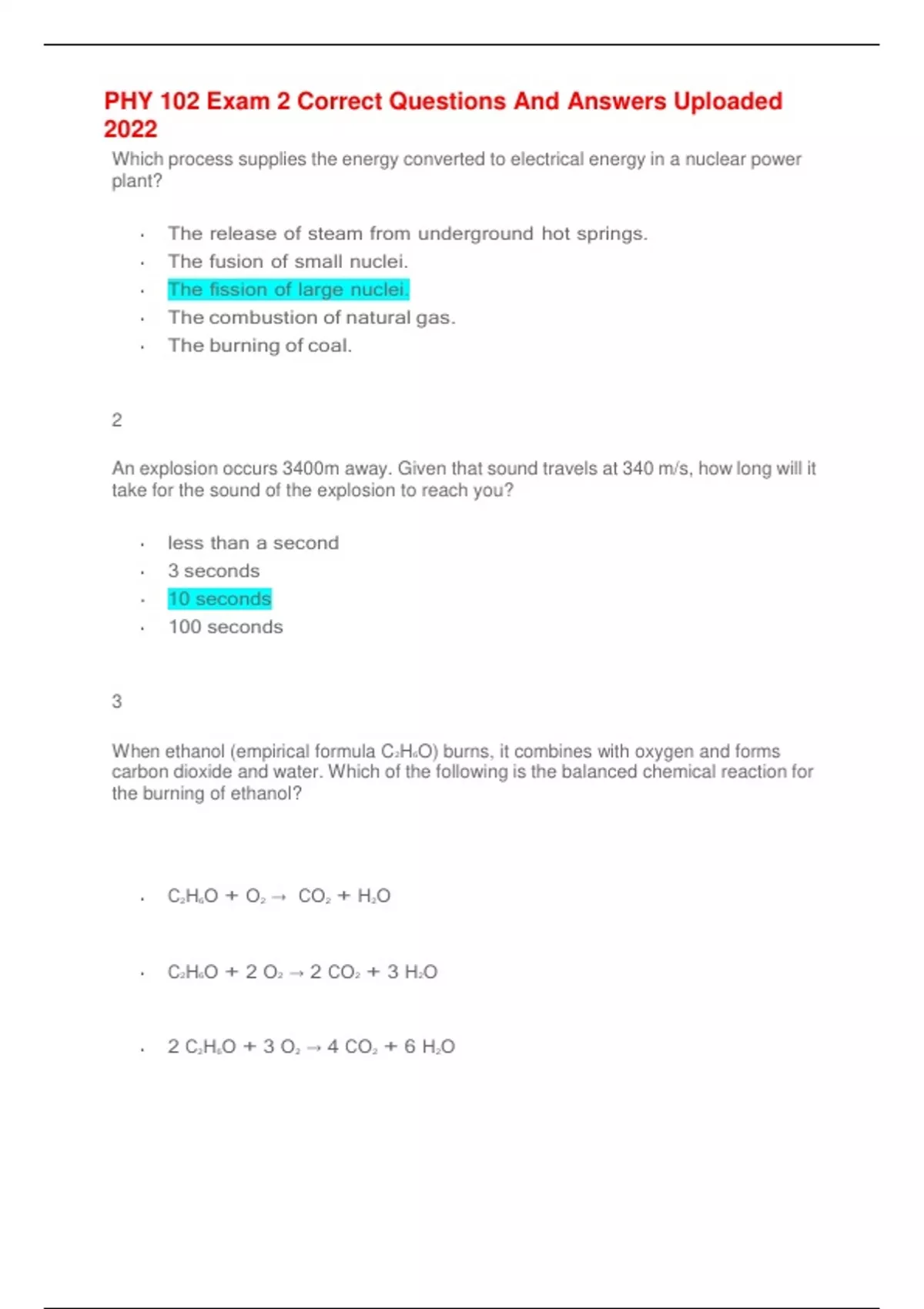 Which process supplies the energy converted to electrical energy in a nuclear power plant? The release of steam from underground hot springs. The fusion of small nuclei. The fission of large nuclei. The combustion of natural gas. The burning of coal. 2 An explosion occurs 3400m away. Given that sound travels at 340 m/s, how long will it take for the sound of the explosion to reach you? less than a second 3 seconds 10 seconds 100 seconds 3 When ethanol (empirical formula C2H6O) burns, it combines with oxygen and forms carbon dioxide and water. Which of the following is the balanced chemical reaction for the burning of ethanol? C2H6O + O2 → CO2 + H2O C2H6O + 2 O2 → 2 CO2 + 3 H2O 2 C2H6O + 3 O2 → 4 CO2 + 6 H2O C2H6O + 3 O2 → 2 CO2 + 3 H2O C2H6O + 2 O2 → 2 CO2 + 2 H2O 4. When two light nuclei fuse together, mass Is conserved. Is converted to energy. Is created from energy. Is increased. 5 Which of the following is an example of a chemical change? An ice cube melting. A sheet of metal being formed into a jewelry box. A candle burning. A window breaking. 6 Sulfur dichloride is a cherry-red liquid. Which of the following is true about sulfur dichloride? It is a covalent molecule with one sulfur atom for each two chlorine atoms. It is an ionic compound with one sulfur atom for each two chlorine atoms. It is a covalent molecule with two sulfur atoms for each one chlorine atom. It is an ionic compound with two sulfur atoms for each one chlorine atom. It is a covalent molecule with one sulfur atom for each one chlorine atom. 7 Oxygen-16, oxygen-17, and oxygen-18 are: Different elements. Different ions. Different isotopes. Different materials 8 Which of the following is an example of a compound? A neon gas. Table salt crystals. A sample of soil from the yard. A bar of gold. 9 An element is characterized by: The number of protons in the atom. The mass of the atom. The number of neutrons in the atom. The size of the atom. 10 Which of the following is NOT a physical property? Density Flammability Hardness Melting point 11 The primary colors of light are: Red, blue, and green Red, yellow, and blue Magenta, cyan, and yellow Green, blue, red and yellow 12 In the periodic table, a set of properties repeat from: element to element. column to column. row to row. group to group. 13 Which of the following statements is true? Chemical reaction rates vary with the conditions of the reaction, but nuclear decay rates do not. Nuclear decay rates vary with the conditions of the reaction, but chemical reaction rates do not. Both chemical reaction rates and nuclear decay rates vary with the conditions of the reaction. Neither chemical reaction rates nor nuclear decay rates vary with the conditions of the reaction. 14 What is the ultimate source of all electromagnetic waves? Vibrating molecules Radio antennas Light bulbs Vibrating charged particles Vibrating atoms 15 Different components of blood can be separated by their densities in a centrifuge. This is because blood is: