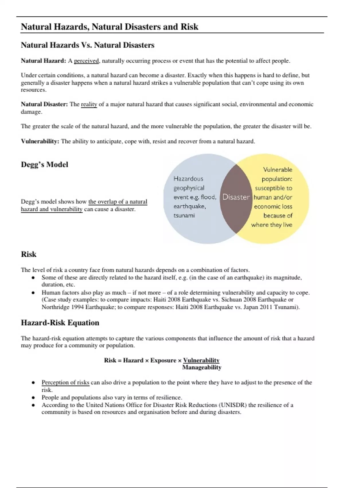 Detailed and comprehensive notes for unit 1 topic 1 (tectonic processes and hazards), covering the sub-topics of hazards, risk, vulnerability and governance. Includes models such as Degg's model, PAR model and risk-poverty nexus.