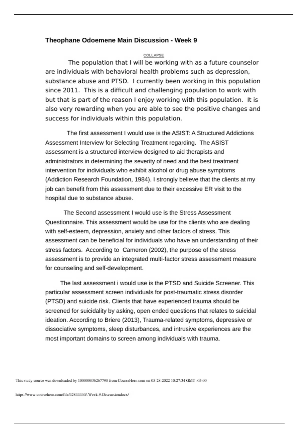 The population that I will be working with as a future counselor are individuals with behavioral health problems such as depression, substance abuse and PTSD. I currently been working in this population since 2011. This is a difficult and challenging population to work with but that is part of the reason I enjoy working with this population. It is also very rewarding when you are able to see the positive changes and success for individuals within this population. The first assessment I would use is the ASIST: A Structured Addictions Assessment Interview for Selecting Treatment regarding. The ASIST assessment is a structured interview designed to aid therapists and administrators in determining the severity of need and the best treatment intervention for individuals who exhibit alcohol or drug abuse symptoms (Addiction Research Foundation, 1984). I strongly believe that the clients at my job can benefit from this assessment due to their excessive ER visit to the hospital due to substance abuse. The Second assessment I would use is the Stress Assessment Questionnaire. This assessment would be use for the clients who are dealing with self-esteem, depression, anxiety and other factors of stress. This assessment can be beneficial for individuals who have an understanding of their stress factors. According to Cameron (2002), the purpose of the stress assessment is to provide an integrated multi-factor stress assessment measure for counseling and self-development. The last assessment i would use is the PTSD and Suicide Screener. This particular assessment screen individuals for post-traumatic stress disorder (PTSD) and suicide risk. Clients that have experienced trauma should be screened for suicidality by asking, open ended questions that relates to suicidal ideation. According to Briere (2013), Trauma-related symptoms, depressive or dissociative symptoms, sleep disturbances, and intrusive experiences are the most important domains to screen among individuals with trauma. This study source was downloaded by from CourseH on :27:34 GMT -05:00 Referral Addiction Research Foundation. (1984). ASIST: A Structured Addictions Assessment Interview for Selecting Treatment. Retrieved from https://search direct=true&db=mmt&AN=test.1681&site=ehost-live&scope=site Briere, J. (2013). PTSD and Suicide Screener. Retrieved from https://search direct=true&db=mmt&AN=test.6505&site=ehost-live&scope=site Cameron, A. (2002). Stress Assessment Questionnaire (SAQ): Professional