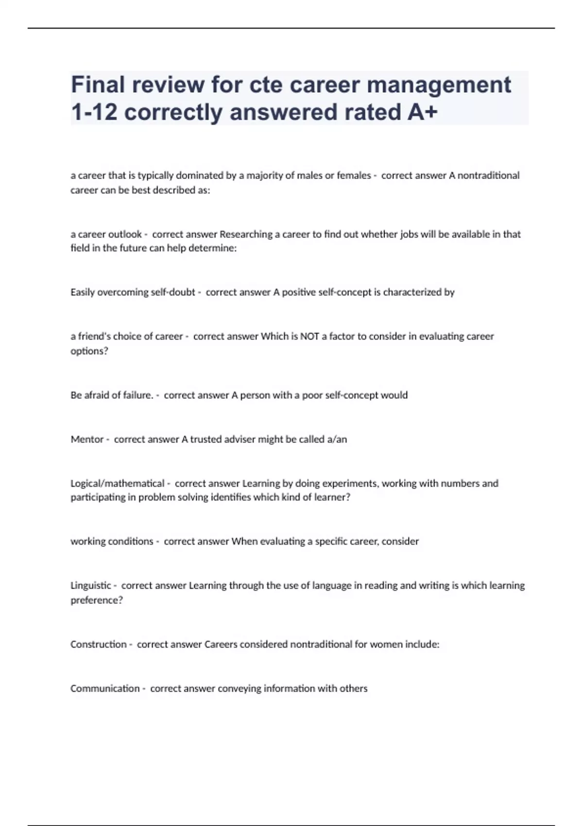 Final review for cte career management 1-12 correctly answered rated A+a career that is typically dominated by a majority of males or females - correct answer A nontraditional career can be best described as: a career outlook - correct answer Researching a career to find out whether jobs will be available in that field in the future can help determine: Easily overcoming self-doubt - correct answer A positive self-concept is characterized by a friend's choice of career - correct answer Which is NOT a factor to consider in evaluating career options? Be afraid of failure. - correct answer A person with a poor self-concept would Mentor - correct answer A trusted adviser might be called a/an Logical/mathematical - correct answer Learning by doing experiments, working with numbers and participating in problem solving identifies which kind of learner? working conditions - correct answer When evaluating a specific career, consider Linguistic - correct answer Learning through the use of language in reading and writing is which learning preference? Construction - correct answer Careers considered nontraditional for women include: Communication - correct answer conveying information with others