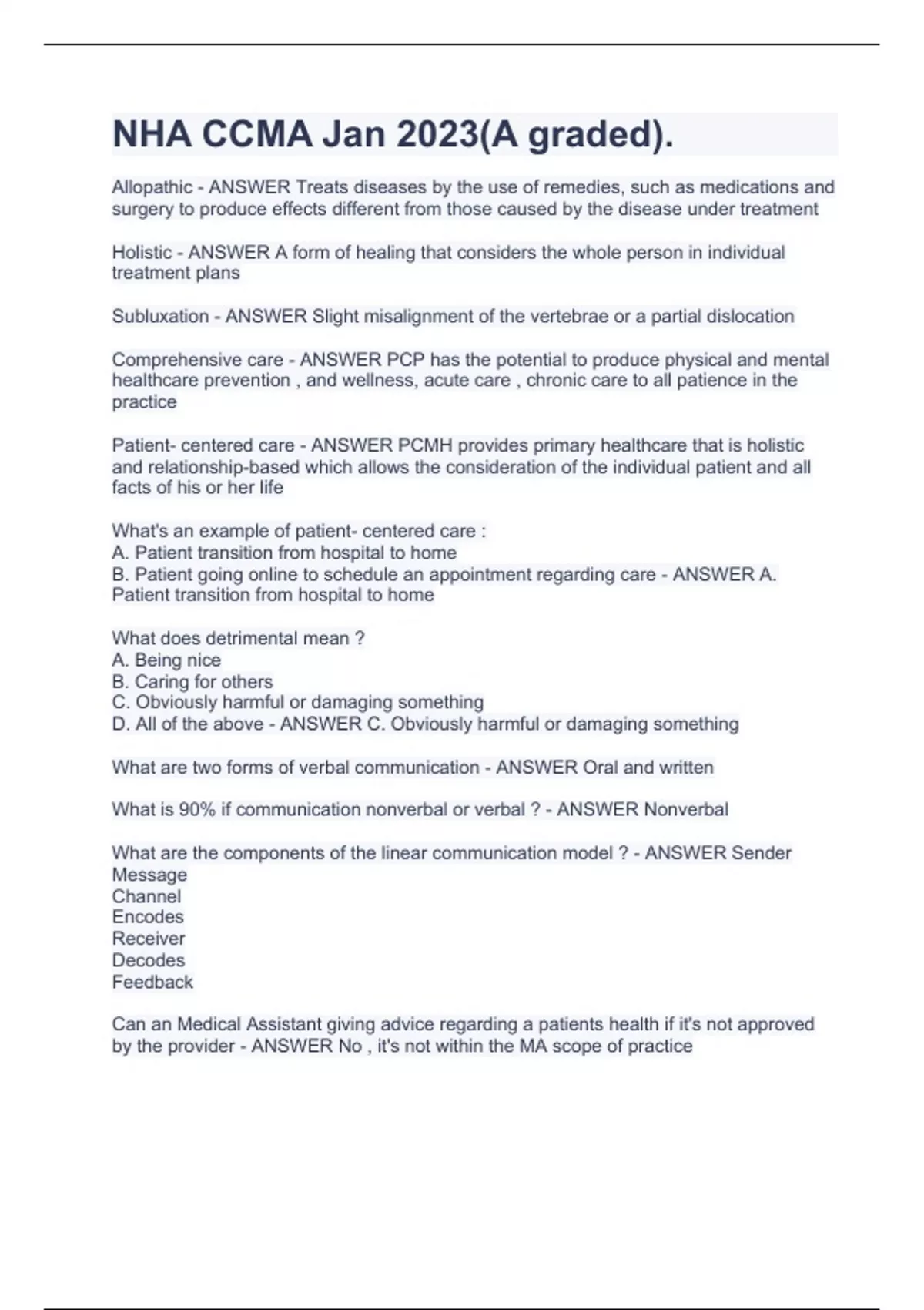 NHA CCMA Jan 2023(A graded).Allopathic - ANSWER Treats diseases by the use of remedies, such as medications and surgery to produce effects different from those caused by the disease under treatment Holistic - ANSWER A form of healing that considers the whole person in individual treatment plans Subluxation - ANSWER Slight misalignment of the vertebrae or a partial dislocation Comprehensive care - ANSWER PCP has the potential to produce physical and mental healthcare prevention , and wellness, acute care , chronic care to all patience in the practice Patient- centered care - ANSWER PCMH provides primary healthcare that is holistic and relationship-based which allows the consideration of the individual patient and all facts of his or her life What's an example of patient- centered care : A. Patient transition from hospital to home B. Patient going online to schedule an appointment regarding care - ANSWER A. Patient transition from hospital to home What does detrimental mean ? A. Being nice B. Caring for others C. Obviously harmful or damaging something D. All of the above - ANSWER C. Obviously harmful or damaging something What are two forms of verbal communication - ANSWER Oral and written What is 90% if communication nonverbal or verbal ? - ANSWER Nonverbal What are the components of the linear communication model ? - ANSWER Sender Message Channel Encodes Receiver Decodes Feedback Can an Medical Assistant giving advice regarding a patients health if it's not approved by the provider - ANSWER No , it's not within the MA scope of practice