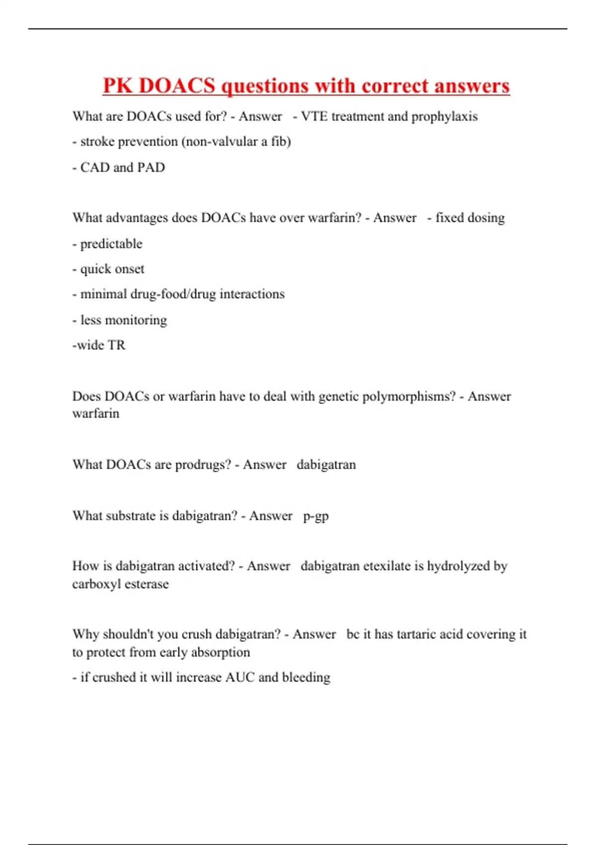 What are DOACs used for? - Answer - VTE treatment and prophylaxis - stroke prevention (non-valvular a fib) - CAD and PAD What advantages does DOACs have over warfarin? - Answer - fixed dosing - predictable - quick onset - minimal drug-food/drug interactions - less monitoring -wide TR Does DOACs or warfarin have to deal with genetic polymorphisms? - Answer warfarin What DOACs are prodrugs? - Answer dabigatran What substrate is dabigatran? - Answer p-gp How is dabigatran activated? - Answer dabigatran etexilate is hydrolyzed by carboxyl esterase Why shouldn't you crush dabigatran? - Answer