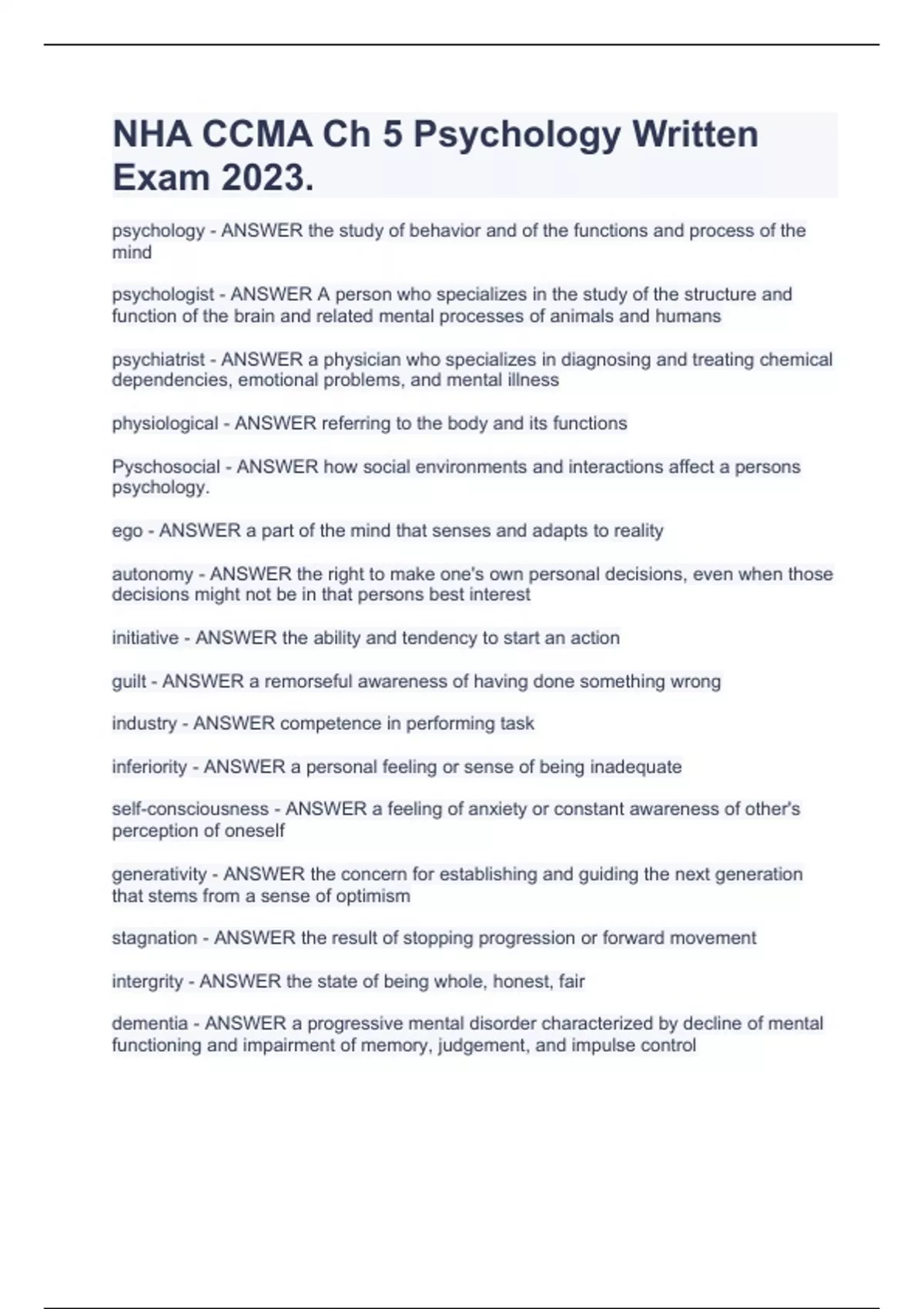NHA CCMA Ch 5 Psychology Written Exam ology - ANSWER the study of behavior and of the functions and process of the mind psychologist - ANSWER A person who specializes in the study of the structure and function of the brain and related mental processes of animals and humans psychiatrist - ANSWER a physician who specializes in diagnosing and treating chemical dependencies, emotional problems, and mental illness physiological - ANSWER referring to the body and its functions Pyschosocial - ANSWER how social environments and interactions affect a persons psychology. ego - ANSWER a part of the mind that senses and adapts to reality autonomy - ANSWER the right to make one's own personal decisions, even when those decisions might not be in that persons best interest initiative - ANSWER the ability and tendency to start an action guilt - ANSWER a remorseful awareness of having done something wrong industry - ANSWER competence in performing task inferiority - ANSWER a personal feeling or sense of being inadequate self-consciousness - ANSWER a feeling of anxiety or constant awareness of other's perception of oneself generativity - ANSWER the concern for establishing and guiding the next generation that stems from a sense of optimism stagnation - ANSWER the result of stopping progression or forward movement intergrity - ANSWER the state of being whole, honest, fair dementia - ANSWER a progressive mental disorder characterized by decline of mental functioning and impairment of memory, judgement, and impulse control advanced directives - ANSWER a document that communicates a patients specifics wishes for end of life should the patient become unable to do so durable power of attorney for health care - ANSWER a document in which patients designate someone to make healthcare decisions for them if the are unable to do so themselves therapeutic communication - ANSWER the purposeful use of verbal actions and interactions to build and maintain helping relationships with patients and families braille - ANSWER system of writing for the blind the uses that letters represented by raised dots empathy - ANSWER conveyance of an objective awareness and understanding or the feelings, emotions and behaviors of patients including trying to envision what it must be like to be in their situation hospice - ANSWER a service that provides care in varity of setting for patients who have terminal illness that are not expected to lie longer than 6 months objective - ANSWER referring to date or information the observer can see measure or otherwise detect