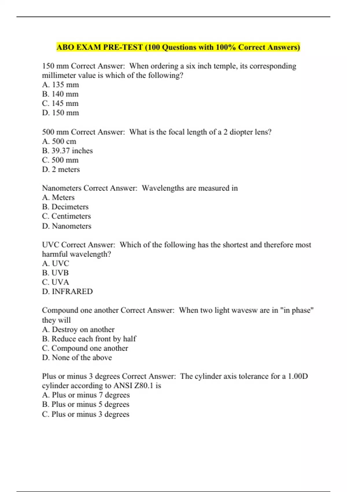 ABO EXAM PRE-TEST (100 Questions with 100% Correct Answers)