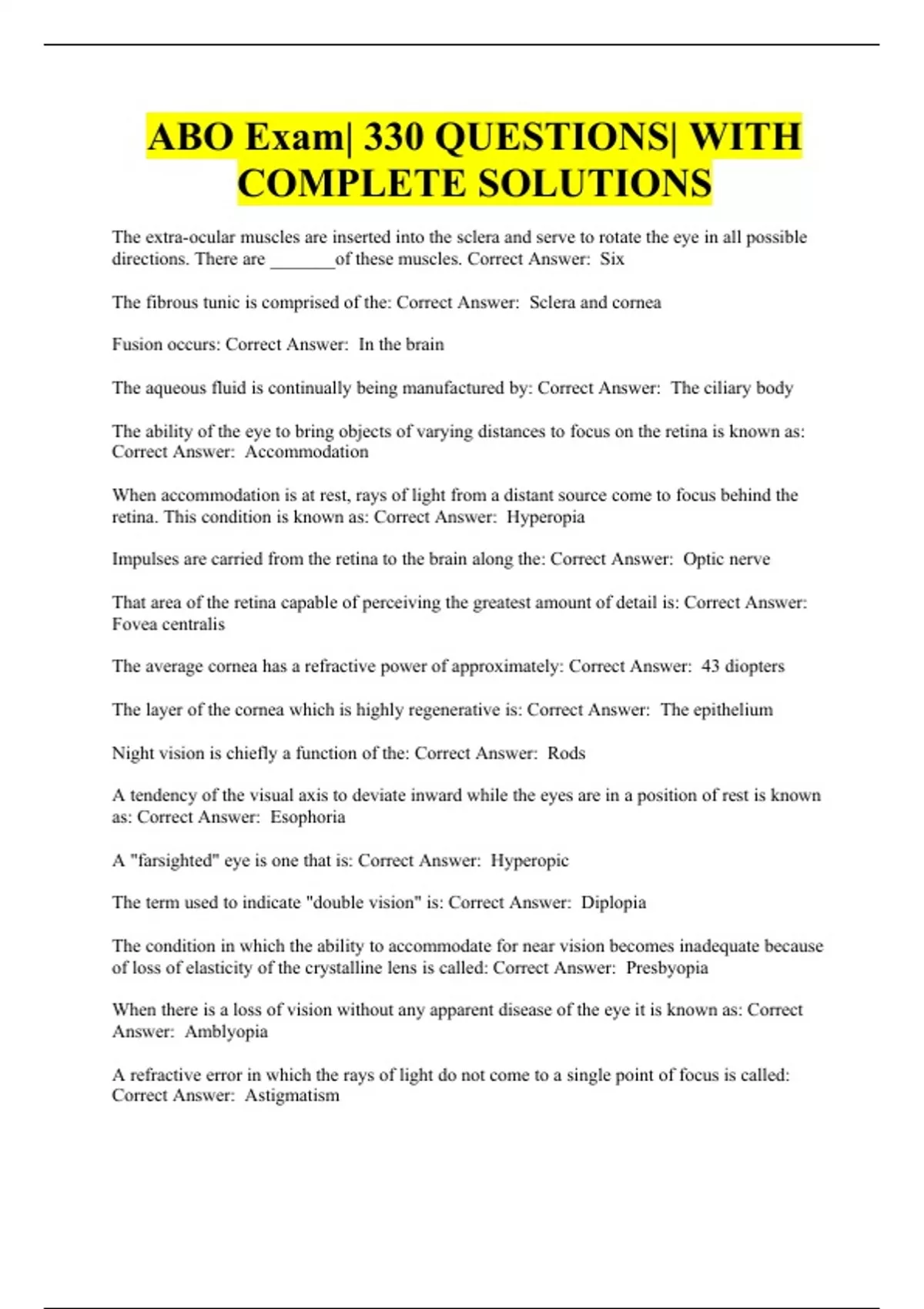 ABO Exam| 330 QUESTIONS| WITH COMPLETE SOLUTIONS