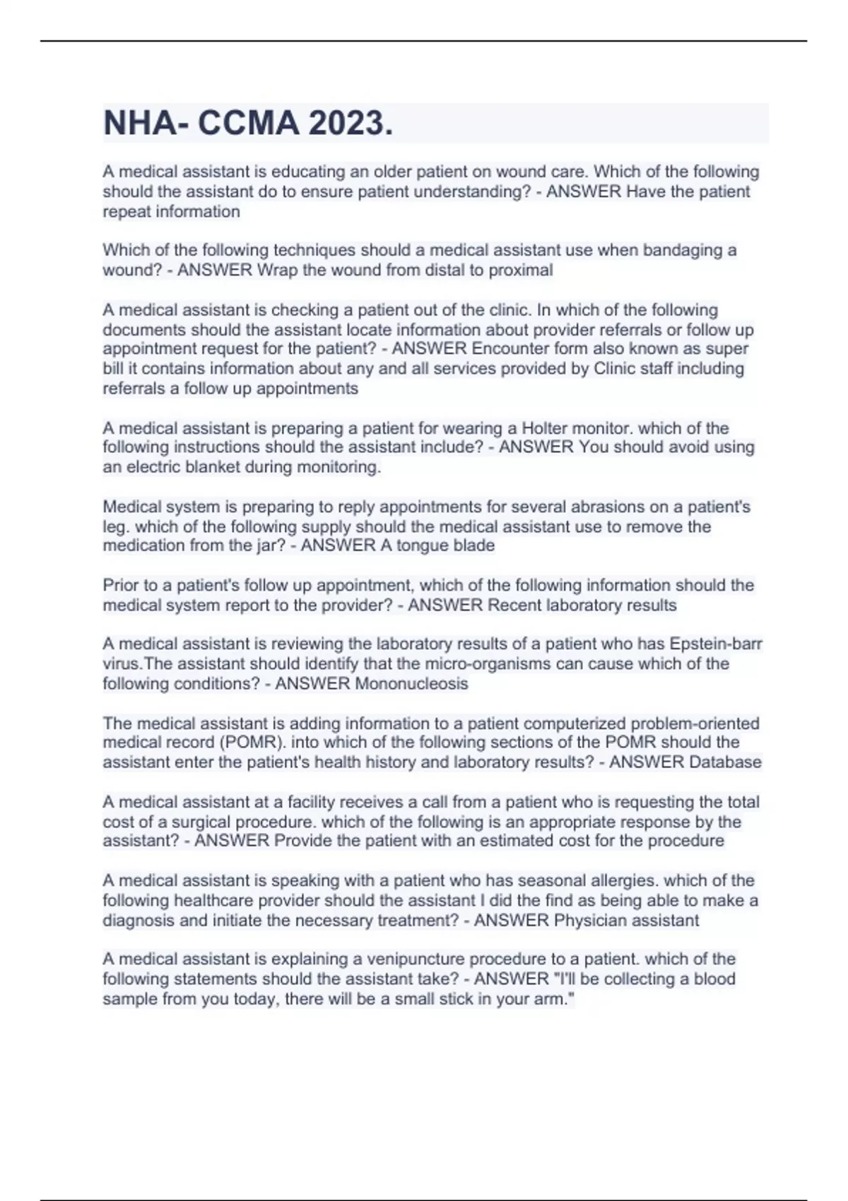 NHA- CCMA 2023. A medical assistant is educating an older patient on wound care. Which of the following should the assistant do to ensure patient understanding? - ANSWER Have the patient repeat information Which of the following techniques should a medical assistant use when bandaging a wound? - ANSWER Wrap the wound from distal to proximal A medical assistant is checking a patient out of the clinic. In which of the following documents should the assistant locate information about provider referrals or follow up appointment request for the patient? - ANSWER Encounter form also known as super bill it contains information about any and all services provided by Clinic staff including referrals a follow up appointments A medical assistant is preparing a patient for wearing a Holter monitor. which of the following instructions should the assistant include? - ANSWER You should avoid using an electric blanket during monitoring. Medical system is preparing to reply appointments for several abrasions on a patient's leg. which of the following supply should the medical assistant use to remove the medication from the jar? - ANSWER A tongue blade Prior to a patient's follow up appointment, which of the following information should the medical system report to the provider? - ANSWER Recent laboratory results A medical assistant is reviewing the laboratory results of a patient who has Epstein-barr virus.The assistant should identify that the micro-organisms can cause which of the following conditions? - ANSWER Mononucleosis The medical assistant is adding information to a patient computerized problem-oriented medical record (POMR). into which of the following sections of the POMR should the assistant enter the patient's health history and laboratory results? - ANSWER Database A medical assistant at a facility receives a call from a patient who is requesting the total cost of a surgical procedure. which of the following is an appropriate response by the assistant? - ANSWER Provide the patient with an estimated cost for the procedure A medical assistant is speaking with a patient who has seasonal allergies. which of the following healthcare provider should the assistant I did the find as being able to make a diagnosis and initiate the necessary treatment? - ANSWER Physician assistant A medical assistant is explaining a venipuncture procedure to a patient. which of the following statements should the assistant take? - ANSWER "I'll be collecting a blood sample from you today, there will be a small stick in your arm."