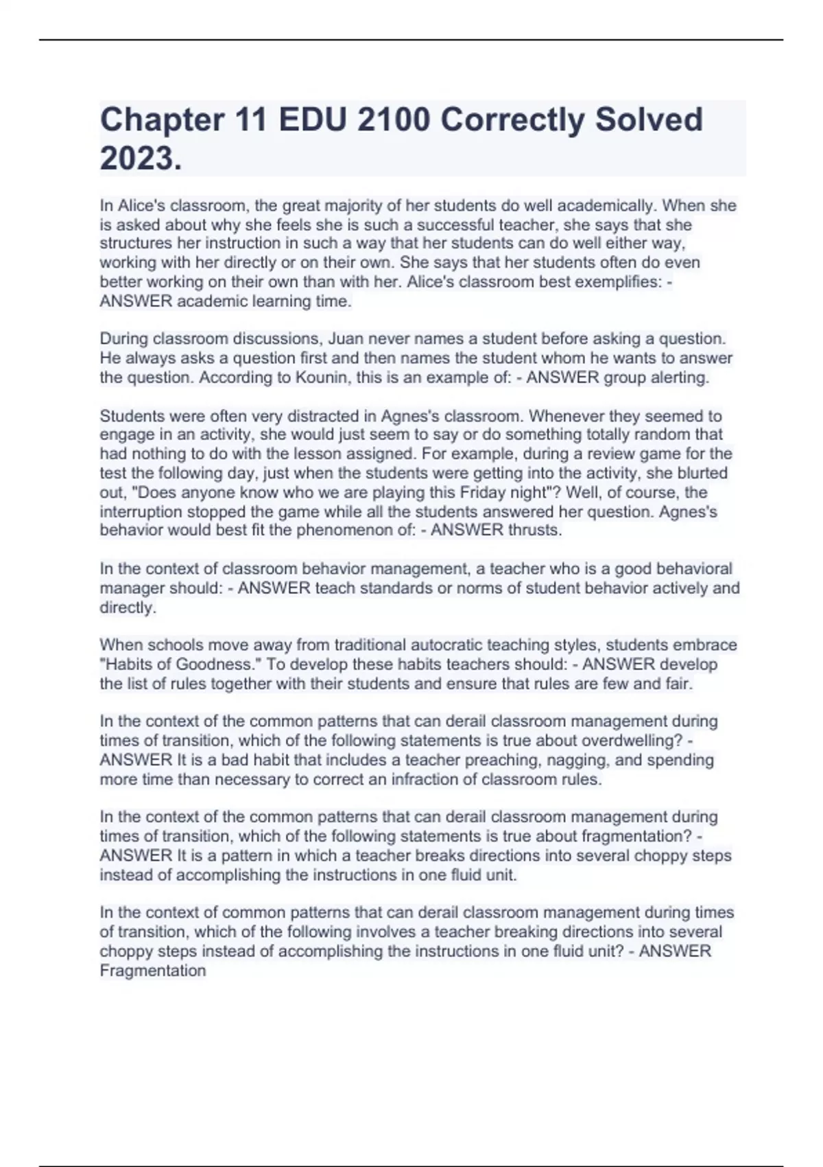 Chapter 11 EDU 2100 Correctly Solved 2023. In Alice's classroom, the great majority of her students do well academically. When she is asked about why she feels she is such a successful teacher, she says that she structures her instruction in such a way that her students can do well either way, working with her directly or on their own. She says that her students often do even better working on their own than with her. Alice's classroom best exemplifies: - ANSWER academic learning time. During classroom discussions, Juan never names a student before asking a question. He always asks a question first and then names the student whom he wants to answer the question. According to Kounin, this is an example of: - ANSWER group alerting. Students were often very distracted in Agnes's classroom. Whenever they seemed to engage in an activity, she would just seem to say or do something totally random that had nothing to do with the lesson assigned. For example, during a review game for the test the following day, just when the students were getting into the activity, she blurted out, "Does anyone know who we are playing this Friday night"? Well, of course, the interruption stopped the game while all the students answered her question. Agnes's behavior would best fit the phenomenon of: - ANSWER thrusts. In the context of classroom behavior management, a teacher who is a good behavioral manager should: - ANSWER teach standards or norms of student behavior actively and directly. When schools move away from traditional autocratic teaching styles, students embrace "Habits of Goodness." To develop these habits teachers should: - ANSWER develop the list of rules together with their students and ensure that rules are few and fair. In the context of the common patterns that can derail classroom management during times of transition, which of the following statements is true about overdwelling? - ANSWER It is a bad habit that includes a teacher preaching, nagging, and spending more time than necessary to correct an infraction of classroom rules. In the context of the common patterns that can derail classroom management during times of transition, which of the following statements is true about fragmentation? - ANSWER It is a pattern in which a teacher breaks directions into several choppy steps instead of accomplishing the instructions in one fluid unit. In the context of common patterns that can derail classroom management during times of transition, which of the following involves a teacher breaking directions into several choppy steps instead of accomplishing the instructions in one fluid unit? - ANSWER Fragmentation