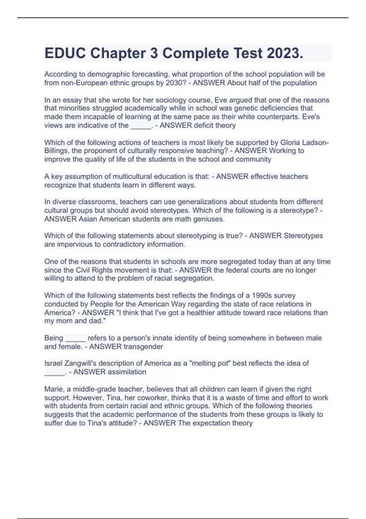 EDUC Chapter 3 Complete Test 2023. According to demographic forecasting, what proportion of the school population will be from non-European ethnic groups by 2030? - ANSWER About half of the population In an essay that she wrote for her sociology course, Eve argued that one of the reasons that minorities struggled academically while in school was genetic deficiencies that made them incapable of learning at the same pace as their white counterparts. Eve's views are indicative of the _____. - ANSWER deficit theory Which of the following actions of teachers is most likely be supported by Gloria Ladson-Billings, the proponent of culturally responsive teaching? - ANSWER Working to improve the quality of life of the students in the school and community A key assumption of multicultural education is that: - ANSWER effective teachers recognize that students learn in different ways. In diverse classrooms, teachers can use generalizations about students from different cultural groups but should avoid stereotypes. Which of the following is a stereotype? - ANSWER Asian American students are math geniuses. Which of the following statements about stereotyping is true? - ANSWER Stereotypes are impervious to contradictory information. One of the reasons that students in schools are more segregated today than at any time since the Civil Rights movement is that: - ANSWER the federal courts are no longer willing to attend to the problem of racial segregation. Which of the following statements best reflects the findings of a 1990s survey conducted by People for the American Way regarding the state of race relations in America? - ANSWER "I think that I've got a healthier attitude toward race relations than my mom and dad." Being _____ refers to a person's innate identity of being somewhere in between male and female. - ANSWER transgender Israel Zangwill's description of America as a "melting pot" best reflects the idea of _____. - ANSWER assimilation Marie, a middle-grade teacher, believes that all children can learn if given the right support. However, Tina, her coworker, thinks that it is a waste of time and effort to work with students from certain racial and ethnic groups. Which of the following theories suggests that the academic performance of the students from these groups is likely to suffer due to Tina's attitude? - ANSWER The expectation theory