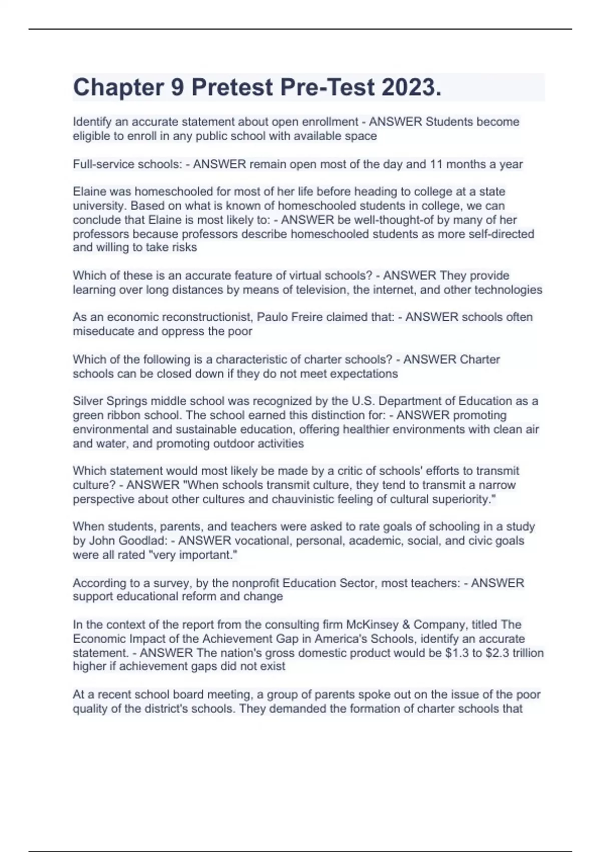 Chapter 9 Pretest Pre-Test 2023.Identify an accurate statement about open enrollment - ANSWER Students become eligible to enroll in any public school with available space Full-service schools: - ANSWER remain open most of the day and 11 months a year Elaine was homeschooled for most of her life before heading to college at a state university. Based on what is known of homeschooled students in college, we can conclude that Elaine is most likely to: - ANSWER be well-thought-of by many of her professors because professors describe homeschooled students as more self-directed and willing to take risks Which of these is an accurate feature of virtual schools? - ANSWER They provide learning over long distances by means of television, the internet, and other technologies As an economic reconstructionist, Paulo Freire claimed that: - ANSWER schools often miseducate and oppress the poor Which of the following is a characteristic of charter schools? - ANSWER Charter schools can be closed down if they do not meet expectations Silver Springs middle school was recognized by the U.S. Department of Education as a green ribbon school. The school earned this distinction for: - ANSWER promoting environmental and sustainable education, offering healthier environments with clean air and water, and promoting outdoor activities Which statement would most likely be made by a critic of schools' efforts to transmit culture? - ANSWER "When schools transmit culture, they tend to transmit a narrow perspective about other cultures and chauvinistic feeling of cultural superiority." When students, parents, and teachers were asked to rate goals of schooling in a study by John Goodlad: - ANSWER vocational, personal, academic, social, and civic goals were all rated "very important." According to a survey, by the nonprofit Education Sector, most teachers: - ANSWER support educational reform and change In the context of the report from the consulting firm McKinsey & Company, titled The Economic Impact of the Achievement Gap in America's Schools, identify an accurate statement. - ANSWER The nation's gross domestic product would be $1.3 to $2.3 trillion higher if achievement gaps did not exist At a recent school board meeting, a group of parents spoke out on the issue of the poor quality of the district's schools. They demanded the formation of charter schools that emphasized a rigorous, traditional curriculum and teacher-centered classrooms. These parents most closely resemble: - ANSWER zealots