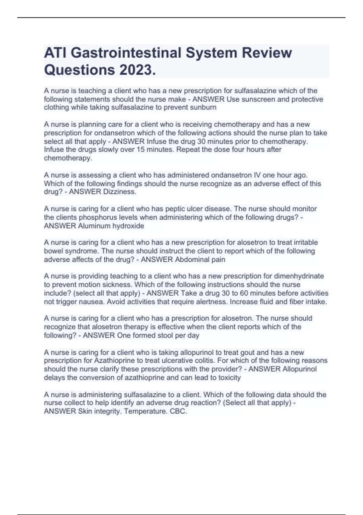 ATI Gastrointestinal System Review Questions 2023 A nurse is teaching a client who has a new prescription for sulfasalazine which of the following statements should the nurse make - ANSWER Use sunscreen and protective clothing while taking sulfasalazine to prevent sunburn A nurse is planning care for a client who is receiving chemotherapy and has a new prescription for ondansetron which of the following actions should the nurse plan to take select all that apply - ANSWER Infuse the drug 30 minutes prior to chemotherapy. Infuse the drugs slowly over 15 minutes. Repeat the dose four hours after chemotherapy. A nurse is assessing a client who has administered ondansetron IV one hour ago. Which of the following findings should the nurse recognize as an adverse effect of this drug? - ANSWER Dizziness. A nurse is caring for a client who has peptic ulcer disease. The nurse should monitor the clients phosphorus levels when administering which of the following drugs? - ANSWER Aluminum hydroxide A nurse is caring for a client who has a new prescription for alosetron to treat irritable bowel syndrome. The nurse should instruct the client to report which of the following adverse affects of the drug? - ANSWER Abdominal pain A nurse is providing teaching to a client who has a new prescription for dimenhydrinate to prevent motion sickness. Which of the following instructions should the nurse include? (select all that apply) - ANSWER Take a drug 30 to 60 minutes before activities not trigger nausea. Avoid activities that require alertness. Increase fluid and fiber intake. A nurse is caring for a client who has a prescription for alosetron. The nurse should recognize that alosetron therapy is effective when the client reports which of the following? - ANSWER One formed stool per day .