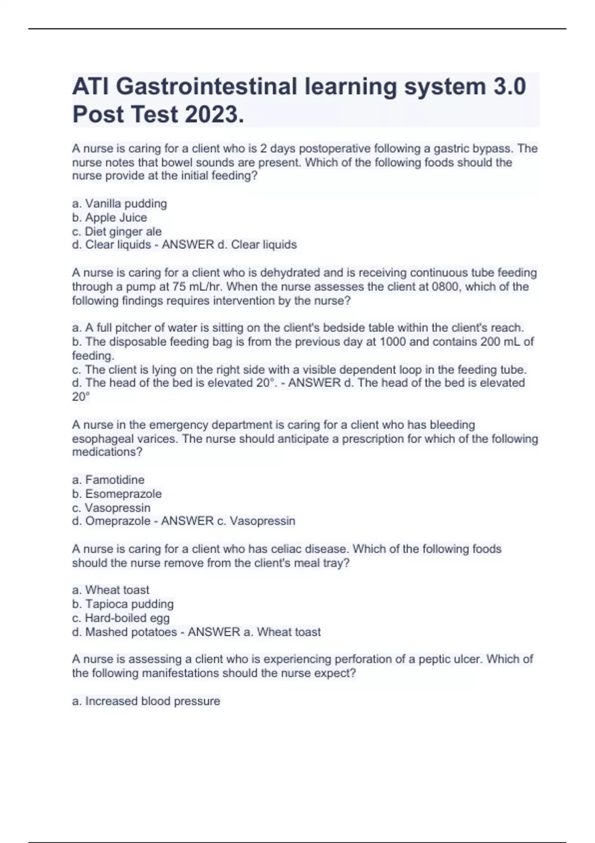 ATI Gastrointestinal learning system 3.0 Post Test 2023. A nurse is caring for a client who is 2 days postoperative following a gastric bypass. The nurse notes that bowel sounds are present. Which of the following foods should the nurse provide at the initial feeding? a. Vanilla pudding b. Apple Juice c. Diet ginger ale d. Clear liquids - ANSWER d. Clear liquids A nurse is caring for a client who is dehydrated and is receiving continuous tube feeding through a pump at 75 mL/hr. When the nurse assesses the client at 0800, which of the following findings requires intervention by the nurse? a. A full pitcher of water is sitting on the client's bedside table within the client's reach. b. The disposable feeding bag is from the previous day at 1000 and contains 200 mL of feeding. c. The client is lying on the right side with a visible dependent loop in the feeding tube. d. The head of the bed is elevated 20°. - ANSWER d. The head of the bed is elevated 20° A nurse in the emergency department is caring for a client who has bleeding esophageal varices. The nurse should anticipate a prescription for which of the following medications? a. Famotidine b. Esomeprazole c. Vasopressin d. Omeprazole - ANSWER c. Vasopressin A nurse is caring for a client who has celiac disease. Which of the following foods should the nurse remove from the client's meal tray? a. Wheat toast b. Tapioca pudding c. Hard-boiled egg d. Mashed potatoes - ANSWER a. Wheat toast A nurse is assessing a client who is experiencing perforation of a peptic ulcer. Which of the following manifestations should the nurse expect? a. Increased blood pressure b. Decreased heart rate c. Yellowing of the skin d. Boardlike abdomen - ANSWER d. Boardlike abdomen A community health nurse is planning an educational program about hepatitis A. When preparing the materials, the nurse should identify that which of the following groups is most at risk for developing hepatitis A? a. Children b. Older adults c. Women who are pregnant d. Middle-aged men - ANSWER a. Children A nurse is caring for a client who has acute pancreatitis. Which of the following serum laboratory values should the nurse anticipate returning to the expected reference range within 72 hr after treatment begins? a. Aldolase b. Lipase c. Amylase d. Lactic dehydrogenase - ANSWER c. Amylase