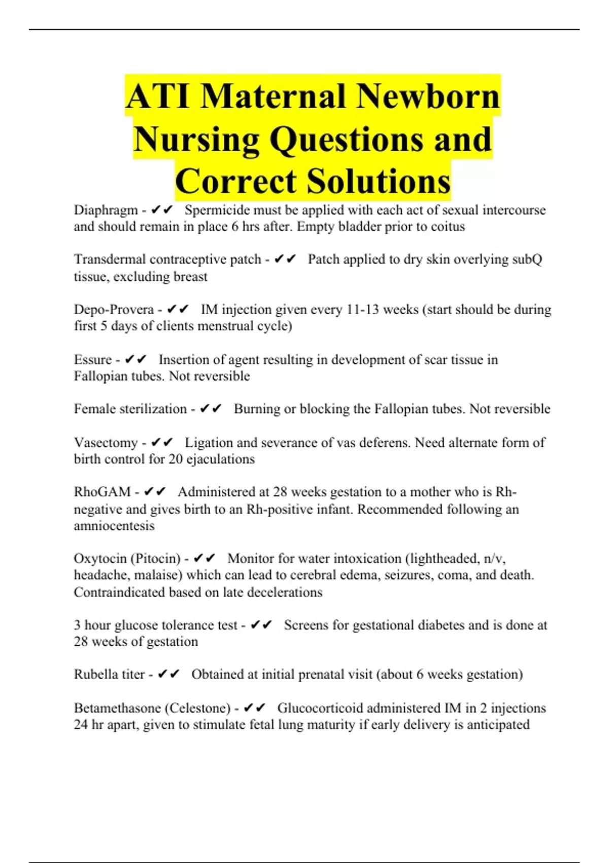 ATI Maternal Newborn Nursing Questions and Correct Solutions