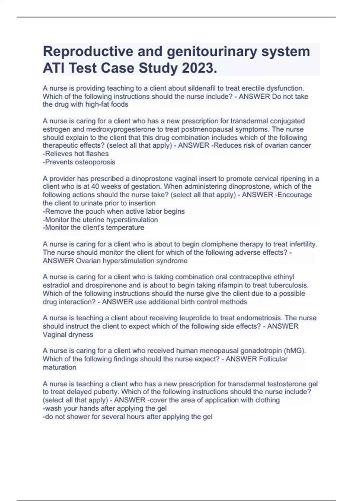 Reproductive and genitourinary system ATI Test Case Study 2023. A nurse is providing teaching to a client about sildenafil to treat erectile dysfunction. Which of the following instructions should the nurse include? - ANSWER Do not take the drug with high-fat foods A nurse is caring for a client who has a new prescription for transdermal conjugated estrogen and medroxyprogesterone to treat postmenopausal symptoms. The nurse should explain to the client that this drug combination includes which of the following therapeutic effects? (select all that apply) - ANSWER -Reduces risk of ovarian cancer -Relieves hot flashes -Prevents osteoporosis A provider has prescribed a dinoprostone vaginal insert to promote cervical ripening in a client who is at 40 weeks of gestation. When administering dinoprostone, which of the following actions should the nurse take? (select all that apply) - ANSWER -Encourage the client to urinate prior to insertion -Remove the pouch when active labor begins -Monitor the uterine hyperstimulation -Monitor the client's temperature A nurse is caring for a client who is about to begin clomiphene therapy to treat infertility. The nurse should monitor the client for which of the following adverse effects? - ANSWER Ovarian hyperstimulation syndrome A nurse is caring for a client who is taking combination oral contraceptive ethinyl estradiol and drospirenone and is about to begin taking rifampin to treat tuberculosis. Which of the following instructions should the nurse give the client due to a possible drug interaction? - ANSWER use additional birth control methods A nurse is teaching a client about receiving leuprolide to treat endometriosis. The nurse should instruct the client to expect which of the following side effects? - ANSWER Vaginal dryness A nurse is caring for a client who received human menopausal gonadotropin (hMG). Which of the following findings should the nurse expect? - ANSWER Follicular maturation A nurse is teaching a client who has a new prescription for transdermal testosterone gel to treat delayed puberty. Which of the following instructions should the nurse include? (select all that apply) - ANSWER -cover the area of application with clothing -wash your hands after applying the gel -do not shower for several hours after applying the gel A nurse is caring for a male client who has hyperthyroidism and is not responding to treatment. The nurse should identify that hyperthyroidism is a contraindication for which of the following drugs? - ANSWER Bethanechol