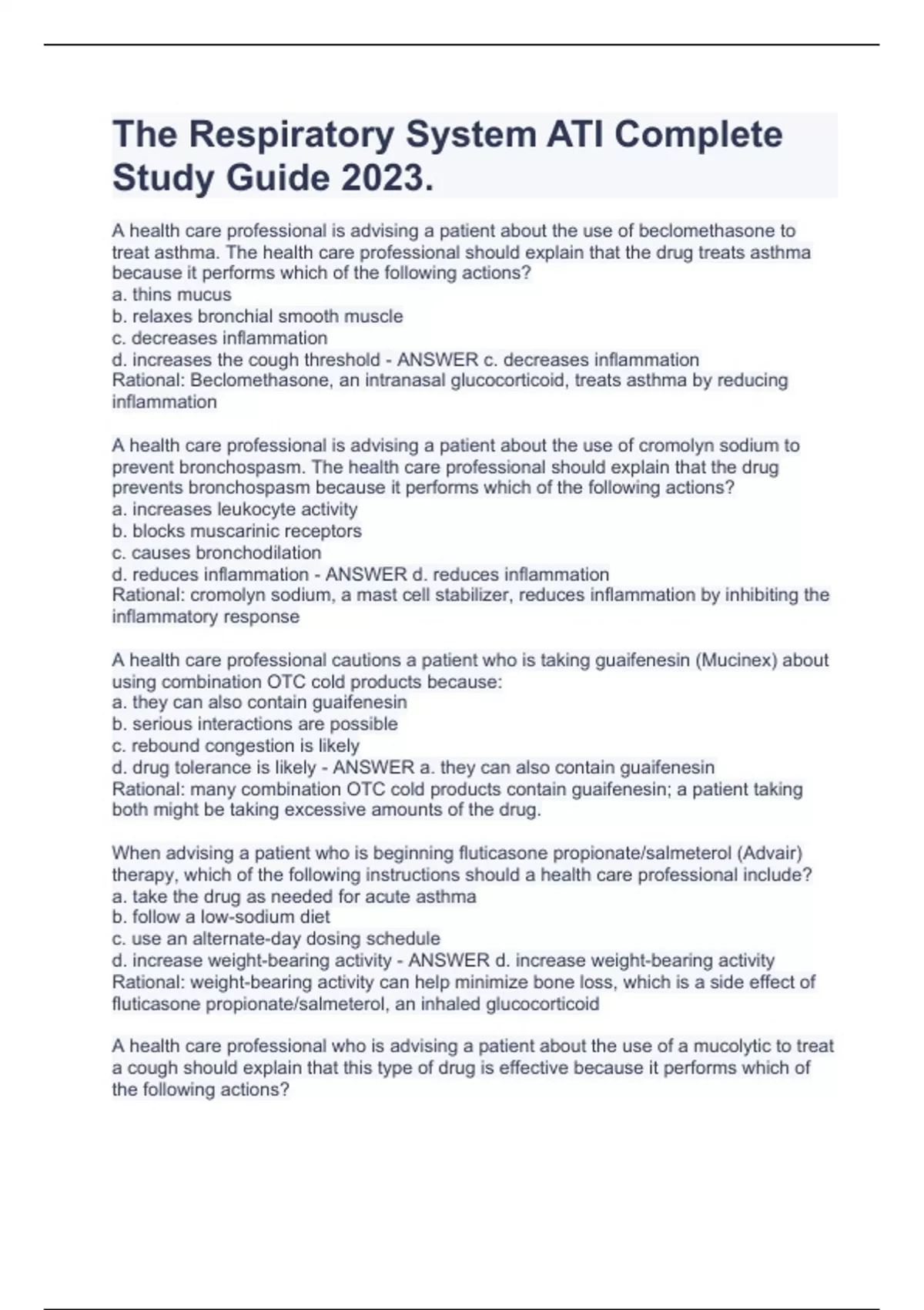 The Respiratory System ATI Complete Study Guide 2023.A health care professional is advising a patient about the use of beclomethasone to treat asthma. The health care professional should explain that the drug treats asthma because it performs which of the following actions? a. thins mucus b. relaxes bronchial smooth muscle c. decreases inflammation d. increases the cough threshold - ANSWER c. decreases inflammation Rational: Beclomethasone, an intranasal glucocorticoid, treats asthma by reducing inflammation A health care professional is advising a patient about the use of cromolyn sodium to prevent bronchospasm. The health care professional should explain that the drug prevents bronchospasm because it performs which of the following actions? a. increases leukocyte activity b. blocks muscarinic receptors c. causes bronchodilation d. reduces inflammation - ANSWER d. reduces inflammation Rational: cromolyn sodium, a mast cell stabilizer, reduces inflammation by inhibiting the inflammatory response A health care professional cautions a patient who is taking guaifenesin (Mucinex) about using combination OTC cold products because: a. they can also contain guaifenesin b. serious interactions are possible c. rebound congestion is likely d. drug tolerance is likely - ANSWER a. they can also contain guaifenesin Rational: many combination OTC cold products contain guaifenesin; a patient taking both might be taking excessive amounts of the drug. When advising a patient who is beginning fluticasone propionate/salmeterol (Advair) therapy, which of the following instructions should a health care professional include? a. take the drug as needed for acute asthma b. follow a low-sodium diet c. use an alternate-day dosing schedule d. increase weight-bearing activity - ANSWER d. increase weight-bearing activity Rational: weight-bearing activity can help minimize bone loss, which is a side effect of fluticasone propionate/salmeterol, an inhaled glucocorticoid A health care professional who is advising a patient about the use of a mucolytic to treat a cough should explain that this type of drug is effective because it performs which of the following actions?